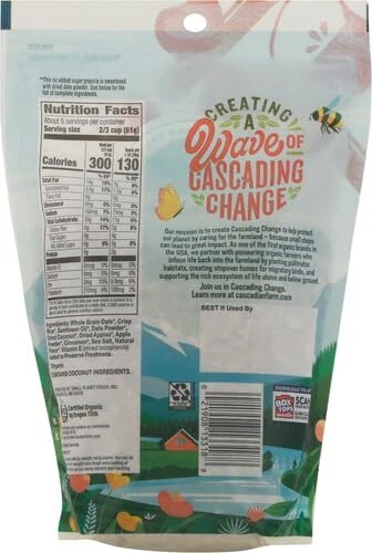 Cascadian Farm Organic Granola with No Added Sugar, Cinnamon Apple Cereal, Resealable Pouch, 11 oz. Description Cascadian Farm Organic Cinnamon Apple Granola is a delightful blend of whole grain oats and apples dusted with cinnamon. Enjoy this cinnamon granola cereal with milk as part of a tasty cold breakfast or eat it by the handful for a quick and easy snack. Best of all, this Cascadian Farm Granola features 23 grams of whole grain per serving and no added sugar, sweetened with fruit. The rich, sweet flavor of dates gives this organic granola just the right hint of sweetness. Now in a convenient resealable pouch. 23g whole grains per serving. At least 48g recommended daily. This no added sugar granola is sweetened with dried date powder. See ingredients for complete list of ingredients. Cascadian Farm has spent more than 50 years working to protect our planet through actions like planting pollinator habitats, helping farmers build healthy soil, and integrating climate-smart crops into our products. Step- by- step, we are reimagining the relationship between food, farmland, nature & communities, seeking to drive and inspire meaningful change along the way. Features: NO ADDED SUGAR: This granola is sweetened with fruit with no added sugar; Comes in a convenient, resealable pouch for maximum freshness and easy opening CINNAMON APPLE GRANOLA: Enjoy this tasty blend of whole grain oats and apples dusted with cinnamon NON-GMO: USDA Certified Organic non-GMO granola WHOLESOME INGREDIENTS: This organic granola has 23 grams of whole grain per serving CONTAINS: 11 oz Product Details: Brand: Cascadian Farm Flavor: Cinnamon Apple Age Range (Description): Adult Item Form: Granola Specialty: Organic Product Dimensions : 3 x 6.5 x 9.5 inches; 11.36 ounces Item model number : 8 UPC : Manufacturer : GENERAL MILLS SALES INC. Country of Origin : USA Handling We will ship all orders within 3 business days of payment. Delivery We do not ship outside of the Continental US. Feedback We take our reputation seriously, we buy and sell online, so we understand the value of trust. If you are unsatisfied with your order, please contact us and we will work with you to resolve it to your satisfaction.
