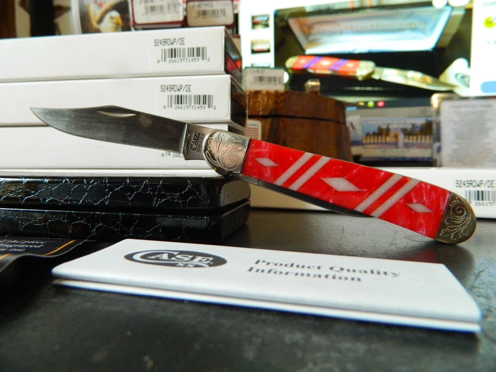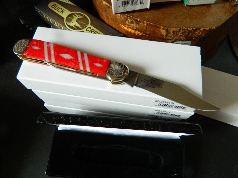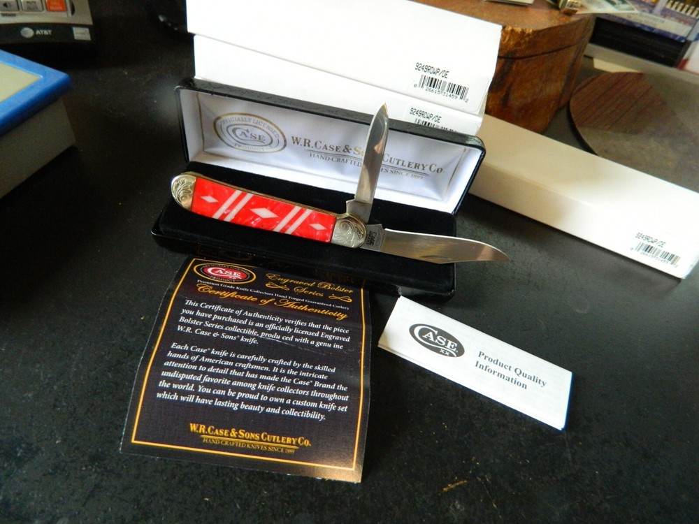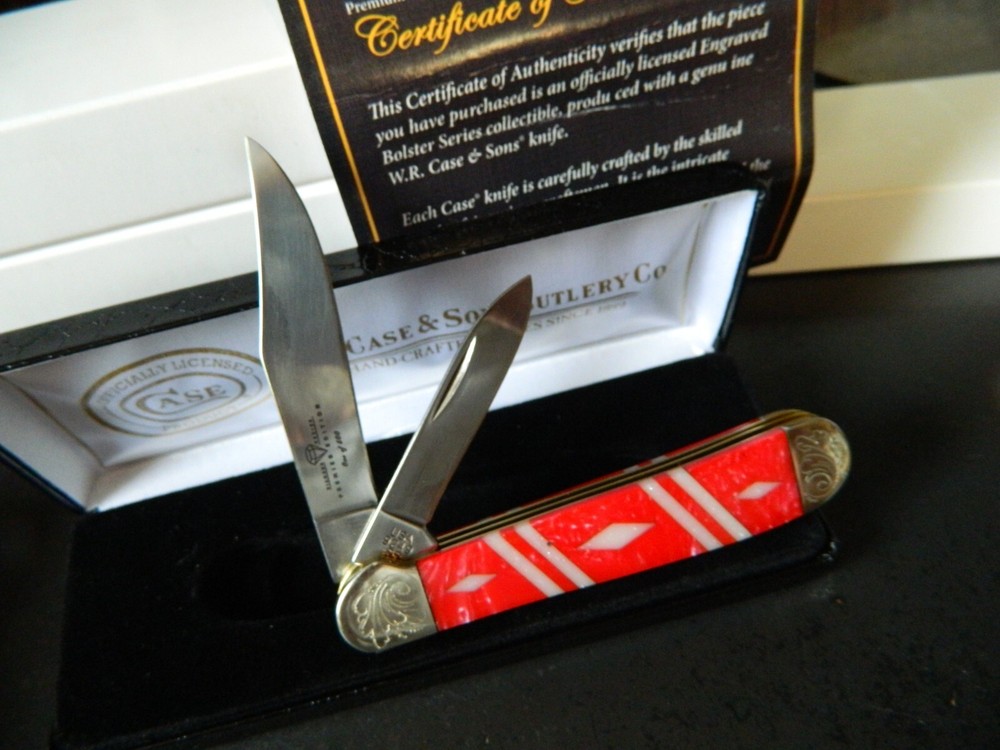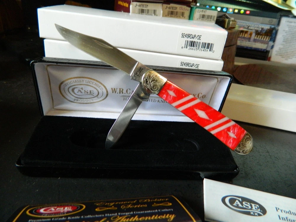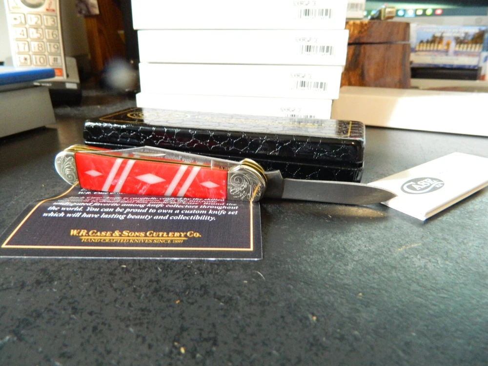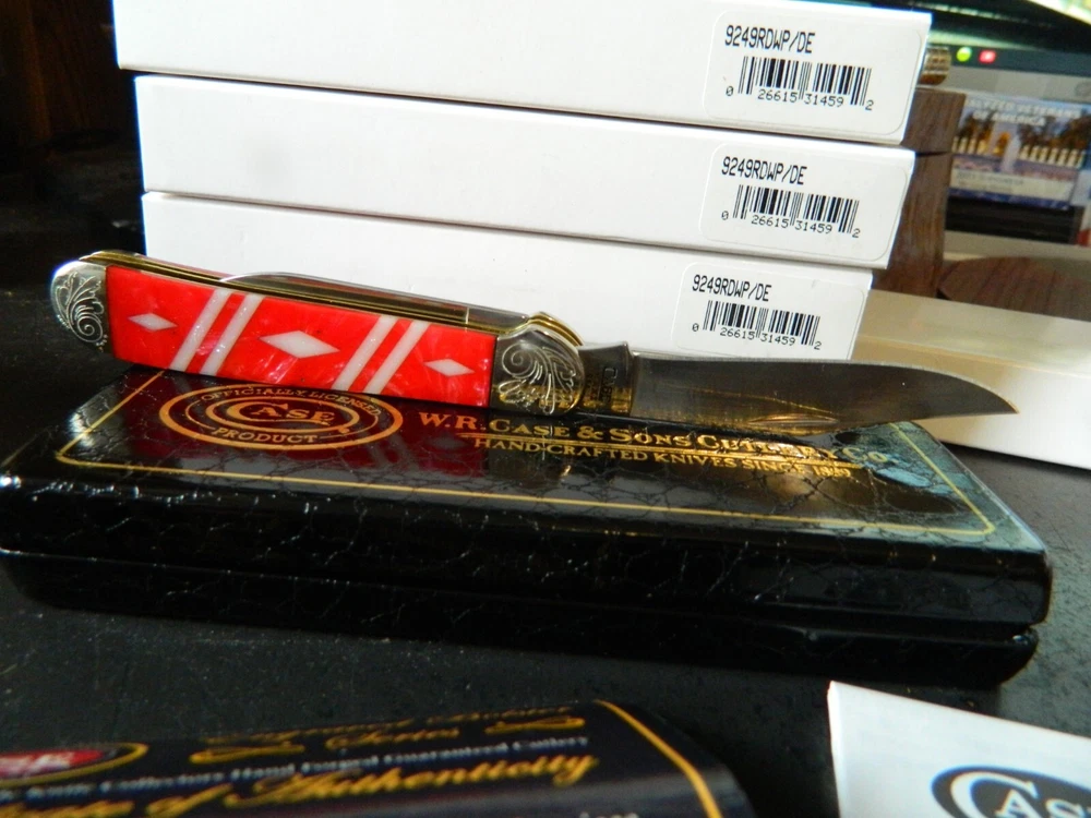 CASE & SONS CUTLERY , Just made 500 ,- 4" COPPERHEAD Pocket Knives called * ENGRAVED BOLSTER SERIES * DIAMOND SERIES PREMIER EDITION 1 OF 500 is etched on the Clip Point Blade. Stamped is CASE MMXXI USA. On the Spear Point Blade is USA 9249 SS. If you look at the Bolsters you can see they are Engraved by Hand, all four bolsters have a design done by one of the craftsman at Case. I put many pictures of one of the five knives we got. What Case has done was picked a Corelon or synthetic scale with its own design these are their *Red & White Diamond scale* , they also have a Blue Diamond and a Green Diamond pattern again all with hand engraved bolsters. We had five of each of those , Case made 5 different colors that we know of and we are buying what we can. This knife is new for us today 2/2/25. They are all Copperhead Knives. Model # 9249RDWP/DE, Weight 3.0oz. with display case 6.8oz. The bolsters are not smooth you can feel these were engraved. and if you are wondering on the certificate of authenticity Engraoed Bolsters, if the spelling was right,- Yes. It is one more reason these are a Limited Edition Custom Hand-Made Knife, we looked for the spelling and found this. The first 20 knives we got Case had a spelling error on the Cert. it appears this was fixed but we have not checked each knife as of yet. Scrolled Bolsters The bolsters are scrolled on both the top and bottom of both sides of the knife. The exquisitely scrolled bolsters add a sparkle and gleam that is unmatched by any other knife. This brand new series of Case knives comes in a Black Display Case. We made sure you can see the display case in the pictures we put in the listing. We could only get 5 of these 9249RDWP/DE. Again we have just five of these knives, and we will give you $$$$$$$$$$$$ FREE SHIPPING $$$$$$$$$$$$$$$$$$ to help you get one. WE THANK YOU AND GOD BLESS YOU,- STAY SAFE. We have been selling knives for 43 years and I have been a licensed dealer for 39 years. This is something I totally enjoy doing, and what you see on ebay is only a handful of our inventory we have 7,000 knives in stock and not 1 is plastic. by adding my eBay Store to your Favorites, . - Sign up and receive our emails, why SALES that is the only email we will ever send to you. We are always trying to get different knives into your hands, so by saving you some money maybe you will try out a new brand. Plus every listing we have is put on sale from the highest to the lowest priced items, and lastly many times we put knives that there are only 1 or 2 left in our stock by receiving our email you will get first shot at these items, Thank you Greg