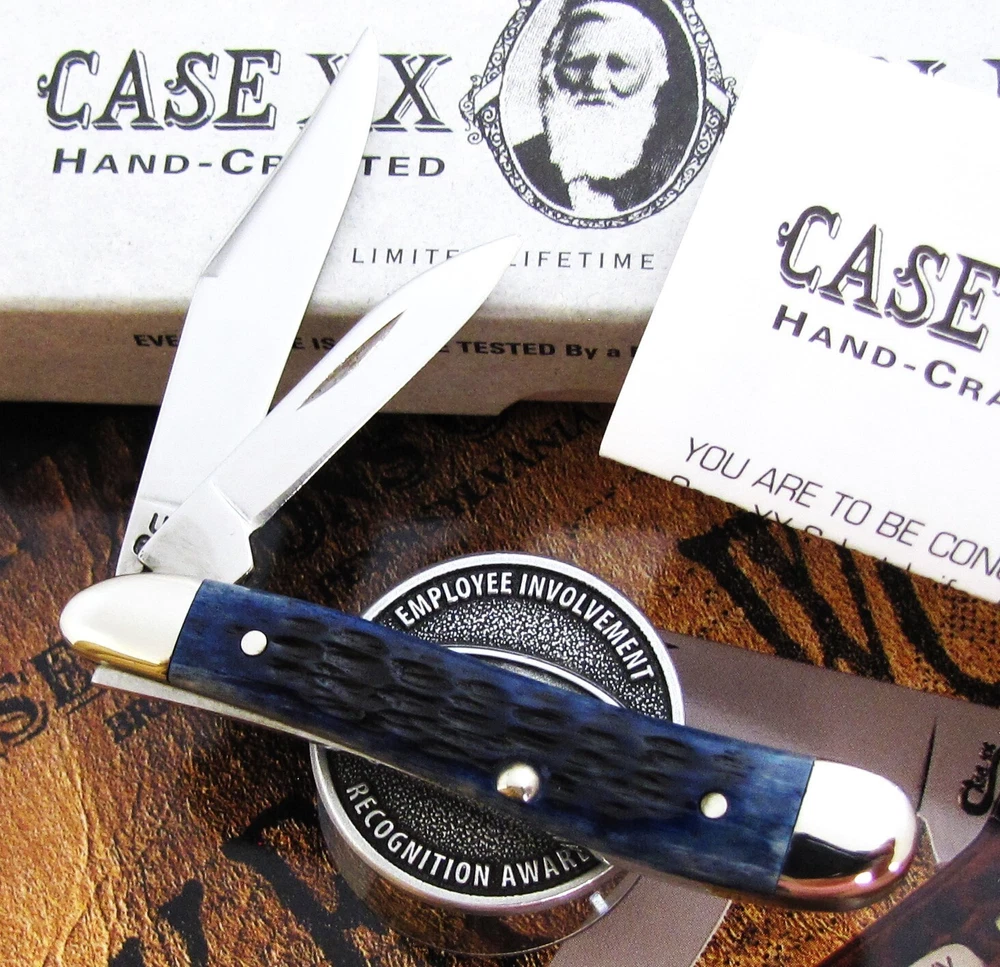 Hi I'm James Parker and I am offering some knives for auction from a fine Case Knife Collection acquisition out of Georgetown, Kentucky. The winning bidder pays $5.95 for USPS Ground Advantage Shipping with Delivery Confirmation included in the Shipping price. This knife for auction is a 1998 issue Case Select Peanut, 2 7/8" closed, featuring the great looking Case "Rogers" Jigged Blue Bone (cattle bone) handles and nickel silver components. This Case Select Peanut originally sold for $59.99 at the few Case Select retailers who were allocated this knife in 1998 - 1999. The master Clip blade is stamped on the front tang with Case XX Select, while the rear tang of this blade is pattern stamped with USA 6220 SS. Both blades have half stops and great "walk and talk" snap. This Case Select Peanut is manufactured with the all nickel silver components. The pins, liners, shield, and bolsters are all composed of nickel silver. This is a desirable feature that Case incorporates into the Case Select Series Knives. Please be sure to see all 5 of the Supersize Photos as this is the EXACT knife the winning bidder will receive. The original carrying pouch is also included - it is in the Case Select box. The Case item number is #02414. This spectacular 1998 issue Case Select Peanut is mint condition in the original issue Case Select factory box with the original Case Select factory brochure and the original older style Case factory paperwork brochure and is being offered at No Reserve. Thanks for your bids, we appreciate it.