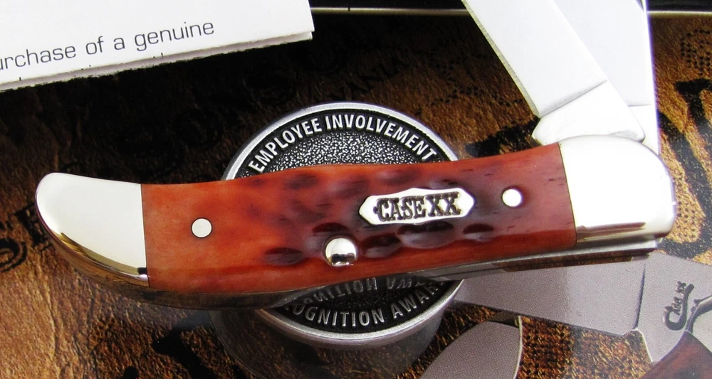 Hi I'm James Parker and I am offering some fine knives for auction from a recent all Case Knife Collection acquisition. The winning bidder pays $5.95 for USPS Ground Mail Shipping with Delivery Confirmation included in the Shipping price. This knife for auction is a 2000 issue Case Select Pocket Hunter, 2 3/4" closed, with Case's "Peachseed" Jigged Pocket Worn finished Tested Red Bone (cattle bone) handles and the all nickel silver components. The front side of the master Clip blade is stamped with Case XX Select while the rear tang of this blade is pattern stamped with USA T.H.62165 SS. Both blades have good "walk and talk" snap. This Case Select Pocket Hunter is manufactured with the all nickel silver components. The pins, liners, shield, and bolsters are all composed of nickel silver. This is a desirable feature that Case incorporates into the Case Select Series knives. Please be sure to see all 5 of the Supersize Photos as this is the EXACT knife the winning bidder will receive. We will ship the Case Select Pocket Hunter in a separate Case factory box for extra protection during transit. This Pocket Hunter WILL NOT be left in the tin to rattle around and get beat up during shipping. The Case item number is #02424. This great 2000 issue Case Select Pocket Hunter is in mint condition with the original issue Case Select factory tin and the original Case Select paperwork brochure and is being offered at No Reserve. Yes A True No Reserve Auction Where The Bidding Starts At .99 Cents. Thanks for your bids, we appreciate it.
