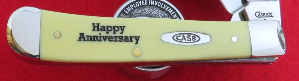Hi I'm James Parker and I am offering some fine knives for auction from a recent all Case Knife Collection acquisition out of Georgetown, Kentucky. The winning bidder pays $4.95 for USPS Ground Advantage Shipping with Delivery Confirmation included in the Shipping price. This knife for auction is a 2009 issue Case Factory Engraved Happy Anniversary Stainless Trapper, 4 1/8" closed, featuring Case's special factory engraving reading in black Happy Anniversary on the front Yellow Synthetic handle. The master Clip blade is stamped on the front tang with Case XX and 1 X, dating this as a 2009 issue Case knife, while the tang of the Spey blade is pattern stamped with 3254 SS. Both blades have very good "walk and talk" snap. Please be sure to see all of the Supersize Photos as this is the EXACT knife the winning bidder will receive. We will provide to the winning bidder a brand new condition unlabeled Case factory box for safe storage. The Case item number is #80161E . This 2009 issue Case Factory Engraved Happy Anniversary Stainless Trapper is being offered in mint condition in the original factory box and is being offered at No Reserve. Yes A True No Reserve Auction Where The Bidding Starts At .99 Cents. Thanks for your bids, we appreciate it.
