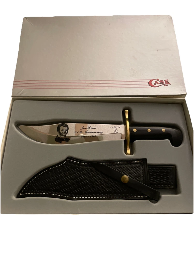 This Case XX USA 1990 Jim Bowie 200th Anniversary Knife features a stainless steel clip point blade with a length of 9.5". The tang is encapsulated, and the handle is made of delrin. It is an original production from the United States, celebrating the 200th anniversary of Jim Bowie. The knife comes in mint condition in its original box, with a sheath included.