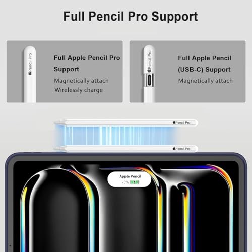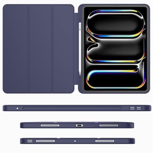 Case for iPad Pro 13 Inch (2024/2025) with Kickstand & Pencil Holder, Dark Blue Compatible with iPad Pro 13 inch (M5) 2025 (A3360, A3361, A3362) and iPad Pro 13 inch (M4) 2024 (A2925, A2926, A3007); check model number on the device bottom. Supports Pencil Pro and Pencil (USB-C) with a magnetic charging side groove and secure magnetic clasp. Features auto wake/sleep function with a powerful magnet for easy on/off and secure closure. Constructed with PU exterior, microfiber lining, and soft TPU back for full protection against shocks, drops, and scratches. Offers dual standing positions for adjustable viewing angles.