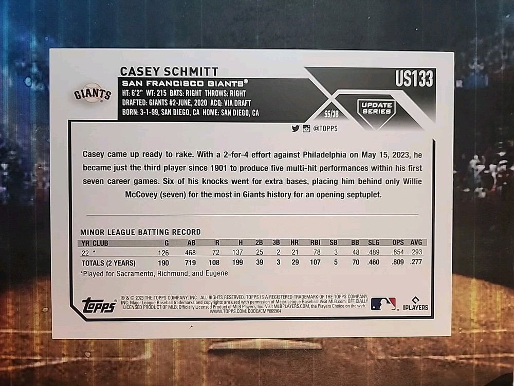 This is an amazing Casey Schmitt 2023 Topps Update Super Box Oversized SP RC #US#133 trading card. With its unique features and high-quality design, it's a must-have for any baseball fan or collector. The card is part of the 2023 Topps set and has been manufactured by Topps, ensuring its authenticity and value. This trading card is a short print and rookie card, making it even more special. It features Casey Schmitt, a talented player/athlete in the Major League (MLB), and has been designed with great attention to detail. The card is perfect for anyone who loves baseball and is looking for a valuable addition to their collection.