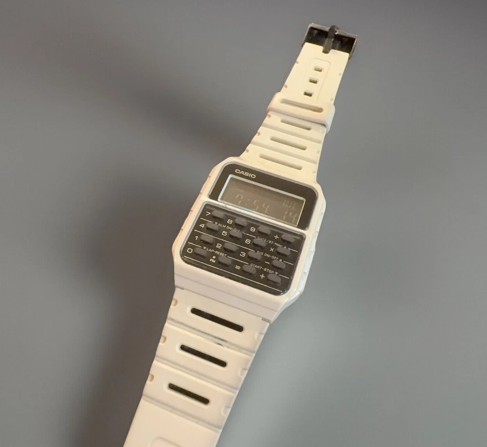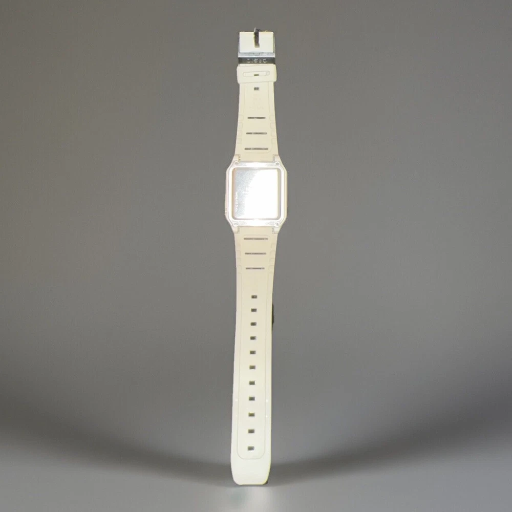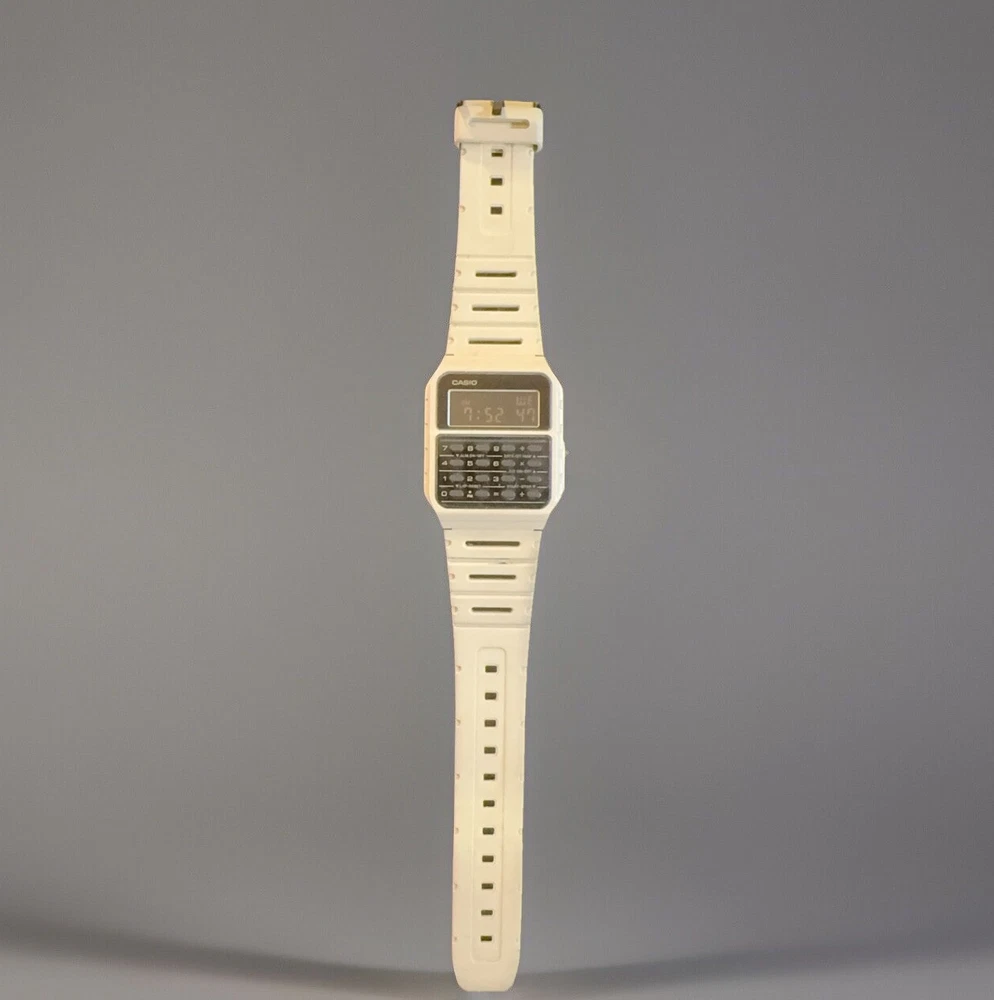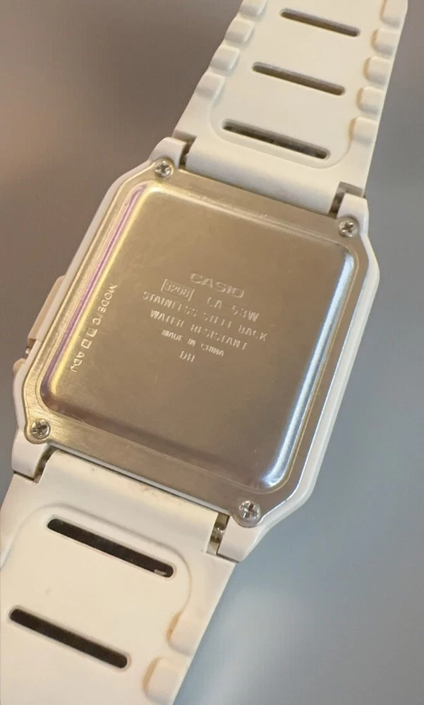 The Casio Databank Men's Quartz Calculator Watch features a white resin band with a black digital dial, housed in a white resin case with a rectangular shape. This multifunctional timepiece includes features like a calculator, alarm, day/date display, and 12/24-hour dial. With a water resistance of 10 meters and a solid caseback, this watch is suitable for everyday wear. The 34.4mm case size and 34mm lug width make it a versatile option for both men and women looking for a casual yet functional accessory.