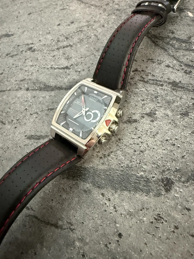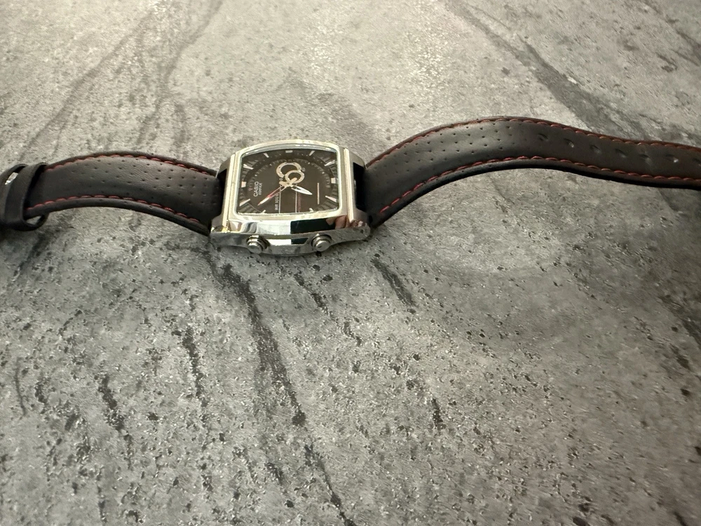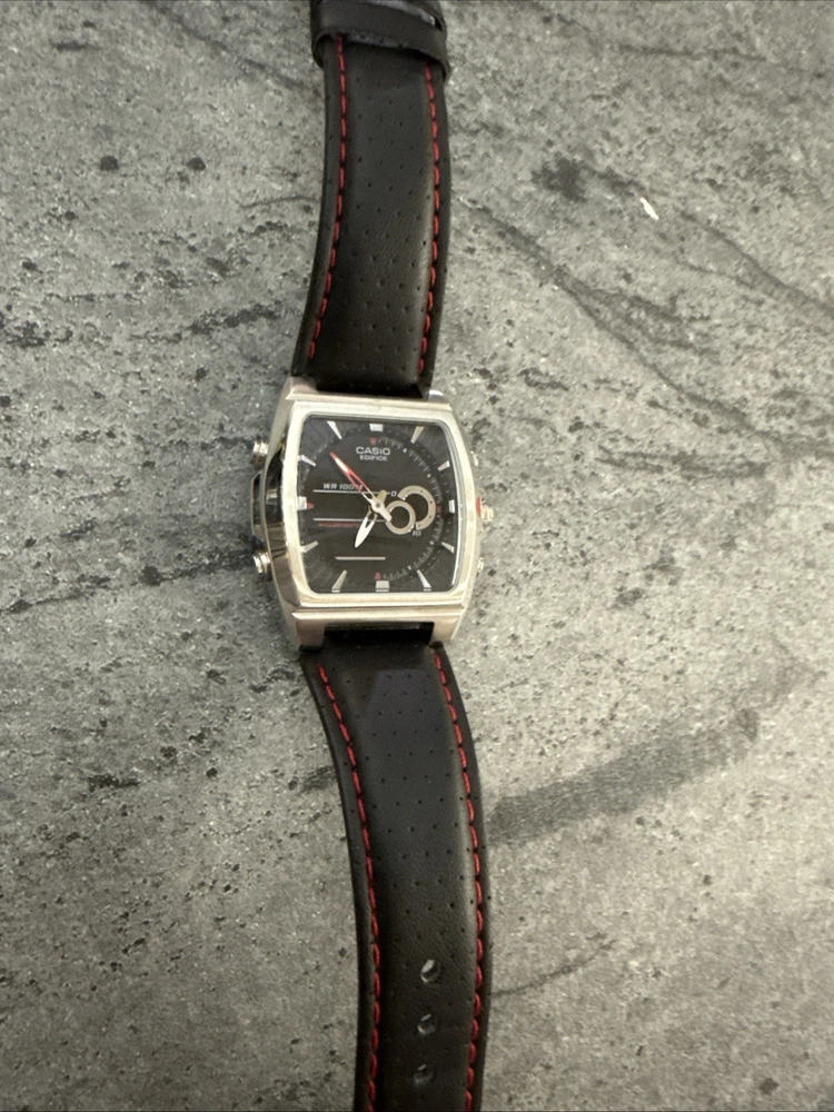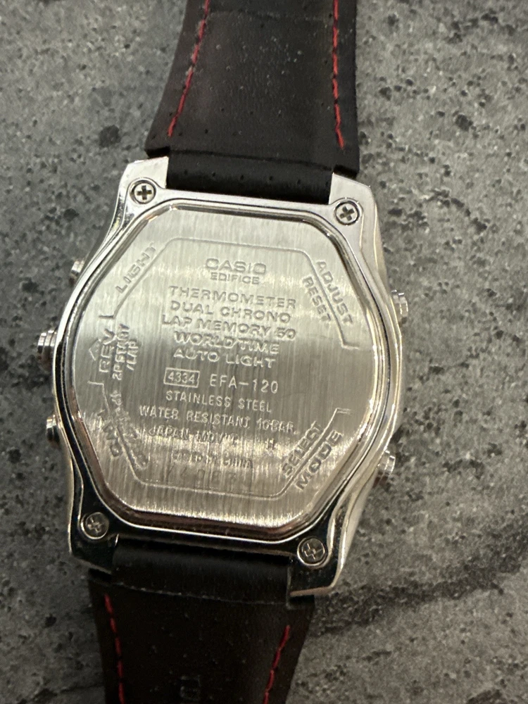 A la venta un reloj de pulsera Casio Edifice EFA-120 para hombre, con una elegante caja rectangular de acero inoxidable y una esfera negra con detalles en rojo. Este reloj está repleto de funciones, que incluyen: ✔ Cronógrafo con memoria de vuelta (50 discos) ✔ Termómetro incorporado para lecturas de temperatura ✔ Función de hora mundial ✔ Luz automática para facilitar la lectura ✔ Resistencia al agua de hasta 100M