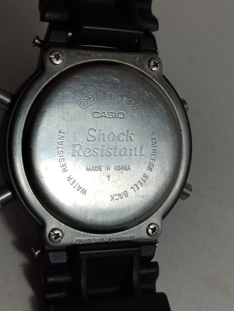 Display:DigitalWatch Features:Alarm, Backlight or Electro Luminescent, Date Indicator, Shock Resistant, Stopwatch, Thermometer, Timer, 24-hour (Military) TimeFace Structure:RoundBattery Life:3 YearsModel:G-ShockBrand:CasioStrap Color:BlackType:WristwatchWatch Shape:RoundMovement Type:Quartz (Battery)Features:Thermometer, Timer, Shock Resistant, Alarm, Stopwatch, Date, Backlight or Electro Luminescent, 24h (Military) TimeDepartment:MenMovement:QuartzReference Number:DW6100_desc_:Dread to tread, as beyond dread is nothing to be shed, says G- shock DW6100. Reflecting unlimited strength by being shock, water and static-resistant time piece, this Casio watch is certainly a mechanical wonder. Mineral crystal dial of this men's wrist watch again makes your watch scratch resistant. With thermometer and sunrise-sunset data that never lets you lag behind, this Casio watch allows you to touch heighten horizons. Water resistant up to 200 meter, this men's wrist watch gives you space to explore your adventurous side and manly manliness. Shock the world with the incredible G- shock DW6100 and defy pre-set laws.
