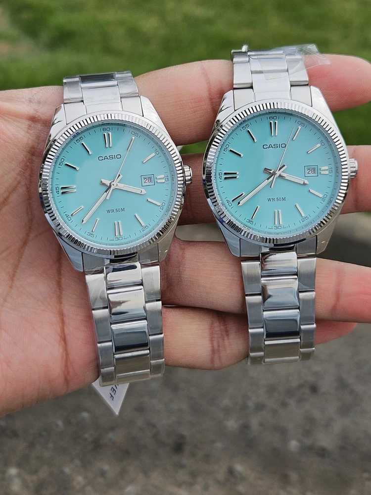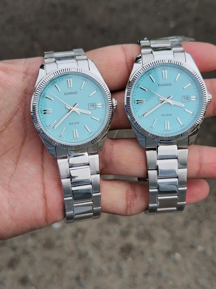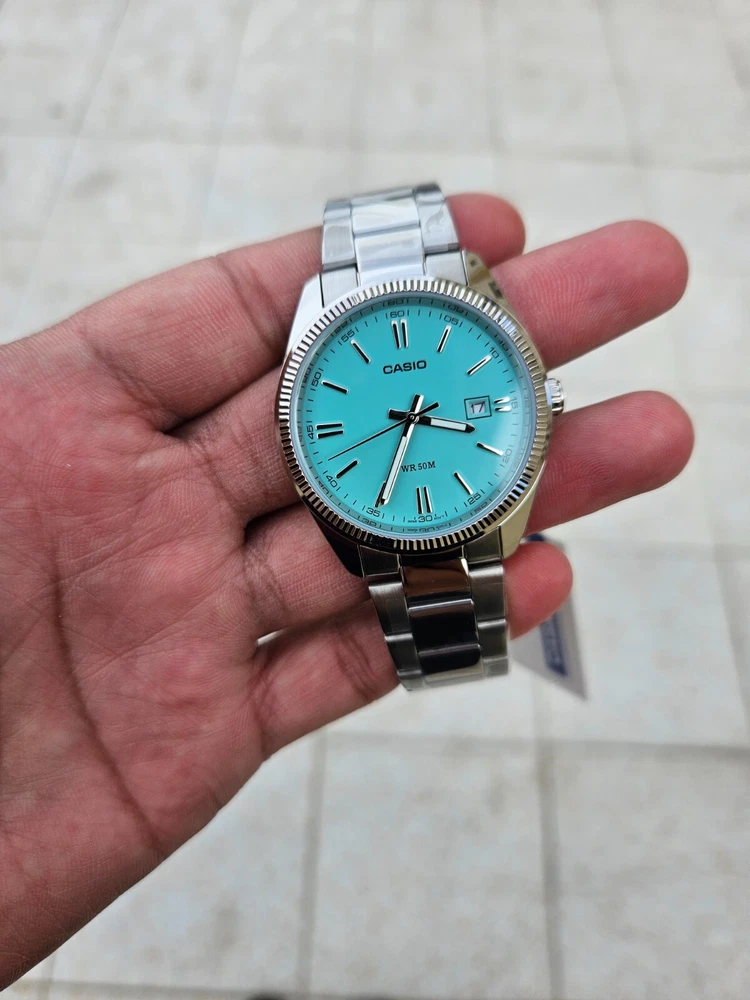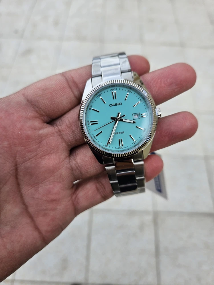 "This Casio MTP-1302PD features a stunning Tiffany Blue dial with a minimalist design, perfect for both casual and formal occasions. It has a date display at the 3 o’clock position and a durable stainless steel case and band. Powered by a reliable quartz movement, this watch ensures precise timekeeping. With its classic yet modern look, this is a must-have for any watch enthusiast!"