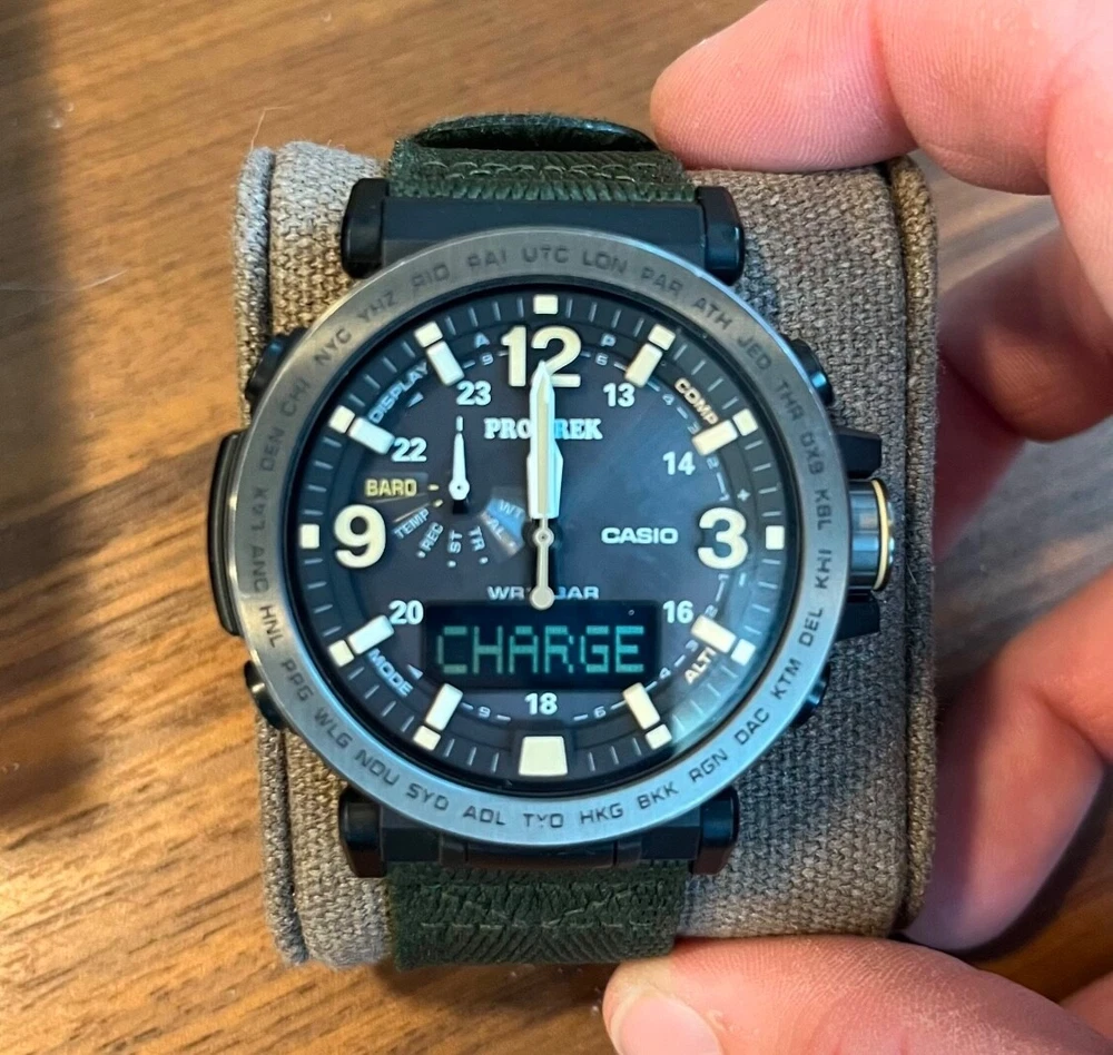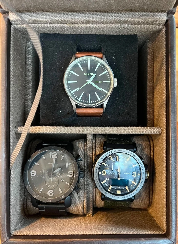 I’m selling three watches in a bundle 1. Brand new Casio Pro Trek PRG600YB Analog/Digital Watch solar watch 2. Fossil/ needs a new battery 3. Nixon/ needs a new battery Comes with the case as seen in the picture.