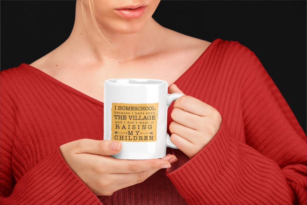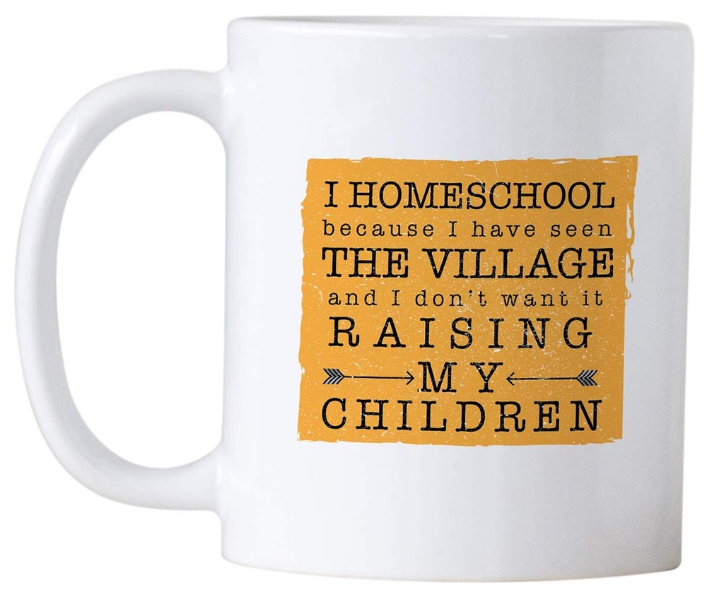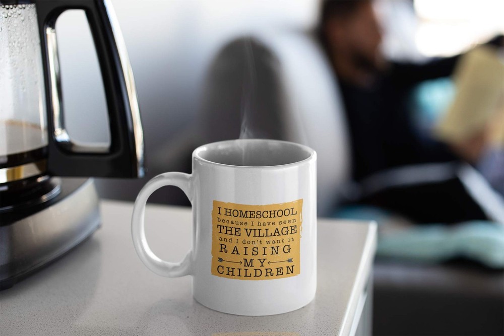 Enjoy your coffee or tea with this awesome Homeschooling mug. I Homeschool Because I Have Seen The Village and I Don't Want It Raising My Children. 11 oz White Ceramic Funny Coffee Mug Design is printed on both sides Dishwasher ( Top Rack ) and Microwave safe under normal use. Mug measures: 4.75 x 3.13 x 3.75 inches