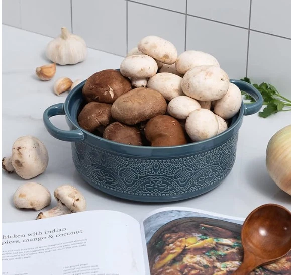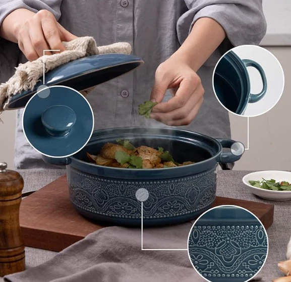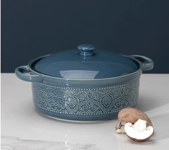 DESCRIPTION: From Oven to Table. Refined embossed design. Oven safe up to 500F and microwave safe AN ELEGANT PIECE of ART: The design of this casserole dish with lid is inspired by 19th century lace patterns, with the classic colors of red, blue and white, making it more like a work of art. I think it should be an integral part of your kitchen MAKE YOUR LIFE BETTER: This casserole dish is perfect for a dinner for 2-3 people. Have a fun evening chatting with your closest people about the fun things going on around you. You can also use it to bring dishes to social parties. The elegant look will not only be the center of attention at the dinner table, but will also make the food more delicious and tastier NATURAL CLARE GLAZE: Traditional glazes are always slightly dull. It took us 3 years of experimenting with many formulas to find a Clare glaze that was 30% brighter than traditional glazes. Not only that, but Claire's glaze also is a lead-free, non-toxic, all-natural glaze, so you can use it with confidence STURDY and DURABLE: We know that ceramic products are always easy to break. Our casserole dish was refined and fired with you in mind. Only we have increased the amount of clay used by 20% to provide you with a sturdier casserole dish. 3/8" thick walls allow food to stay hot longer as well as even heat distribution TIPS: Please note this casserole dish CAN NOT be put on fire/stove/induction cooker