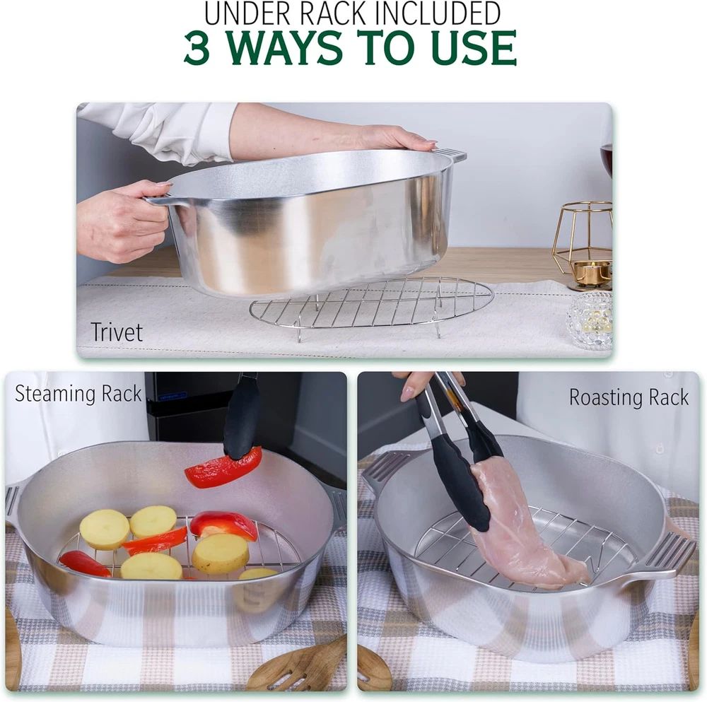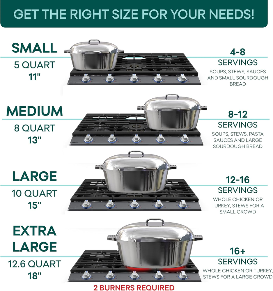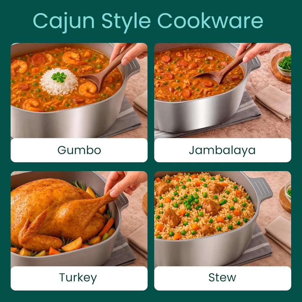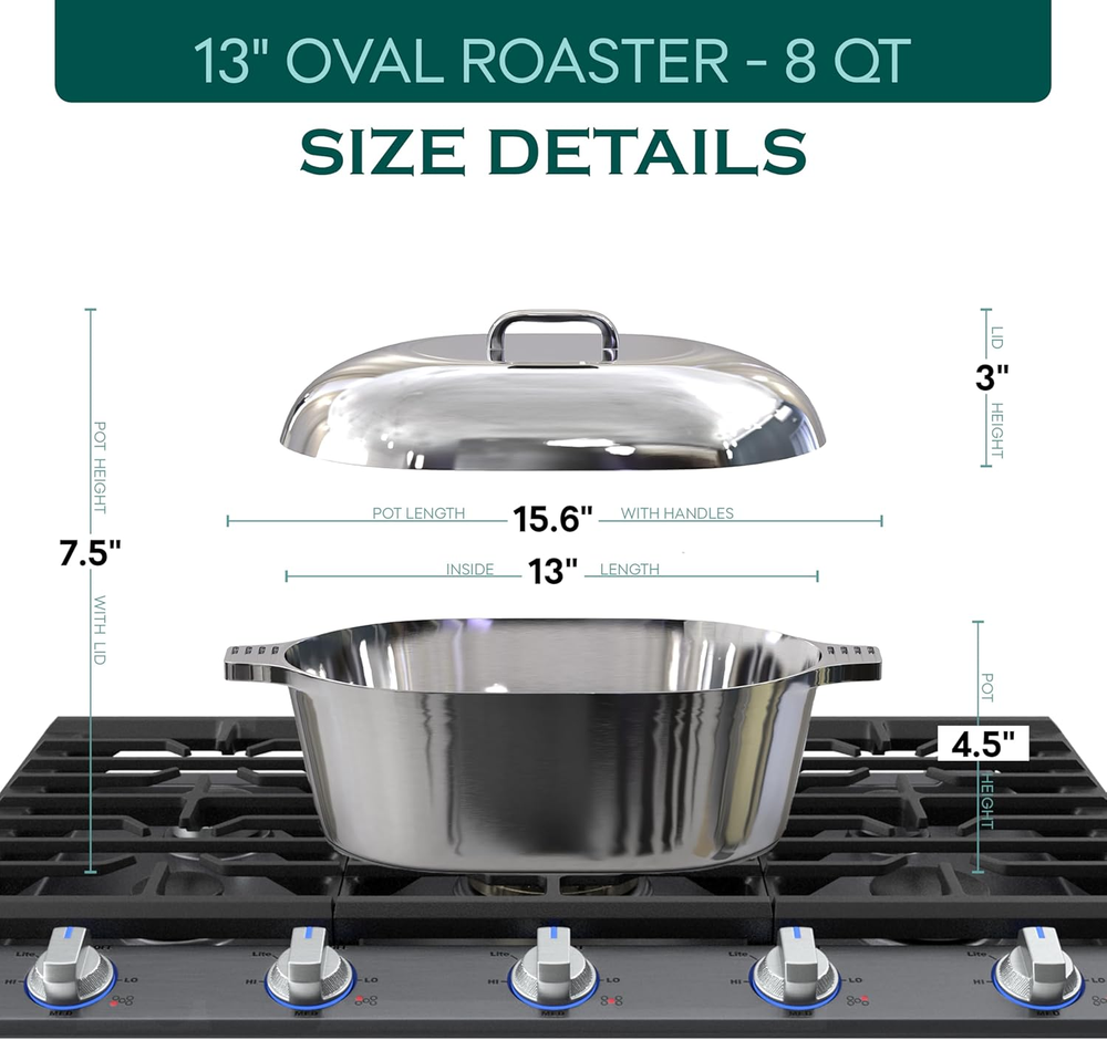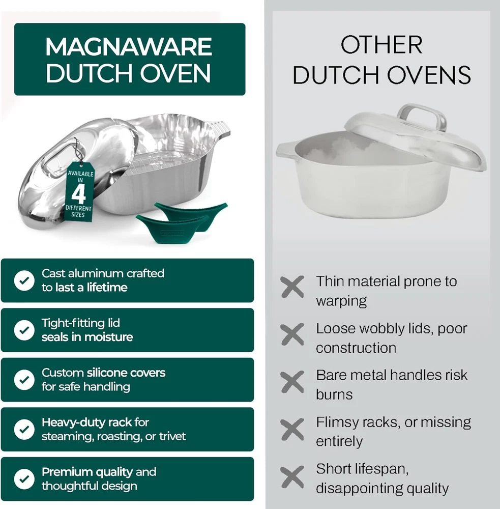 Store New Arrivals Add to Favorite View Feedback Contact Cast Aluminum Oval Dutch Oven with Lid — 8 QT Heavy Duty Roaster Pan with Rack & Silicone Cover Dual Handles — Cajun Cookware for Roasting, Baking, Cooking (13" Medium) Description Item model number OVAL-18 Capacity 8 Quarts Temperature Rating 500 Degrees Fahrenheit Color Aluminum Product Dimensions 15.75"W x 8"H Material Aluminum Is Dishwasher Safe Yes Item Weight 8.29 pounds Is Oven Safe Yes Shape Oval With Lid Yes Lid Material Aluminum Manufacturer Magnaware Finish Type Polished Aluminum Finish Brand MAGNAWARE Product Care Instructions Hand Wash Only Size 13 Inch (Medium) SUPERIOR HEAT DISTRIBUTION: Crafted from premium cast aluminum, this dutch oven ensures even heat distribution, delivering consistently perfect meals. Ideal as an aluminum roaster pan for braising, roasting, baking, and preparing flavorful stews with precision. LIGHTWEIGHT & RUSTPROOF ADVANTAGE: Unlike traditional cast iron cookware, this lightweight dutch oven is rust-resistant and maintenance-free, requiring no seasoning. Enjoy effortless handling, cleaning, and care without sacrificing durability or performance. Compatible with gas, electric, ceramic, and glass stovetops; induction compatibility requires an adapter plate. BUILT TO LAST GENERATIONS: Constructed for durability, this heavy-duty cast aluminum pot is oven safe up to 450°F. MAGNAWARE dutch ovens feature a classic polished aluminum finish that complements any kitchen aesthetic. For best results, simply use a small amount of oil, and to preserve the surface, we recommend silicone, wood, or nylon utensils over metal ones. DESIGNED FOR ALL CULINARY NEEDS: Available in four sizes — including 11" Small, 13" Medium, 15" Large, and 18" X-Large — this oval Dutch oven pot with lid caters to various family sizes and cooking preferences. Each set includes protective silicone handle covers and a stainless steel roasting rack for added convenience. CAJUN COOKING & BEYOND: A true kitchen workhorse, this cast aluminum dutch oven is perfect for Cajun favorites like gumbo and jambalaya, baking artisan bread, simmering hearty soups, and preparing delicious casseroles. Its tight-fitting lid effectively seals in moisture and flavors, enhancing the taste of your meals. Product description The cast aluminum oval Dutch Oven features rapid and even heat distribution, ensuring swift heat transfer to the side walls and the top. Its design enables you to achieve superb cooking results. The oval Dutch Oven features a beautiful mirrored polished exterior, showcasing a sleek retro style. Make a solid statement with this elegant and functional culinary essential. Our cast aluminum oval Dutch Oven features heavy-duty, durable construction designed to withstand the test of time. It meets professional standards, promising satisfying cooking experiences for years. Unlike cast iron, it requires no seasoning, ensuring a low-maintenance cooking companion. It is also rust-resistant, removing the need to worry about its appearance. ABOUT US We offer the best prices around on high quality products. Our E-store includes media such as books, movies, music and games while offering electronics, toys, sporting apparel, clothing, tools, general home, garden items and more. SHIPPING We are always working hard to ensure your package arrives as soon as possible. Please understand that some factors like weather, high postal traffic, and the performance of shipping companies are outside of our control. RETURNS We offer a 30-Day Return Policy on items which you are not completely satisfied with. You have the option for a full-refund or an exchange of the item. No returns are available on items shipped outside of the USA. PAYMENT We accept PayPal. CONTACT US This page content is yet to come Please ad us to your favorite seller and visit again later Thank You CUSTOMER SATISFACTION We try our very best to make sure every customer is completely satisfied. If there's a problem, message us! We're happy to help. WE ACCEPT Copyright © 2021 AutoDS. | All Rights Reserved