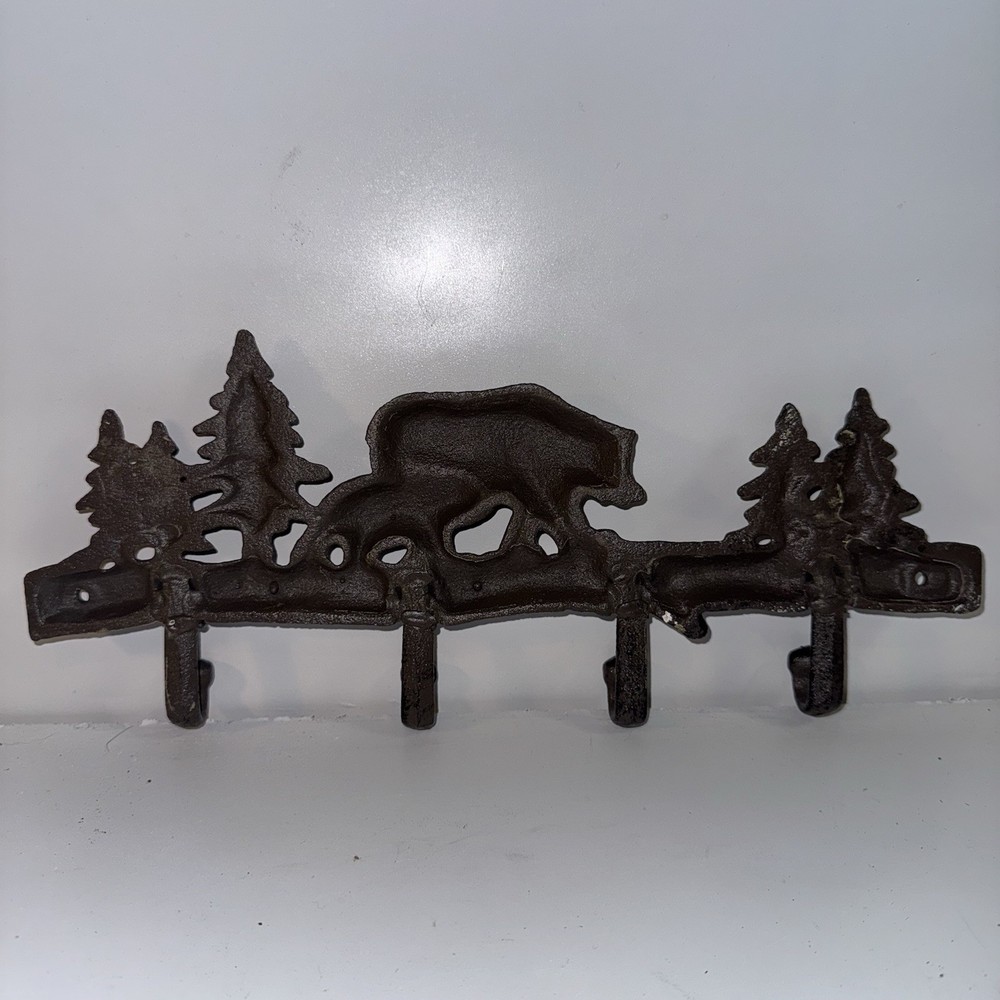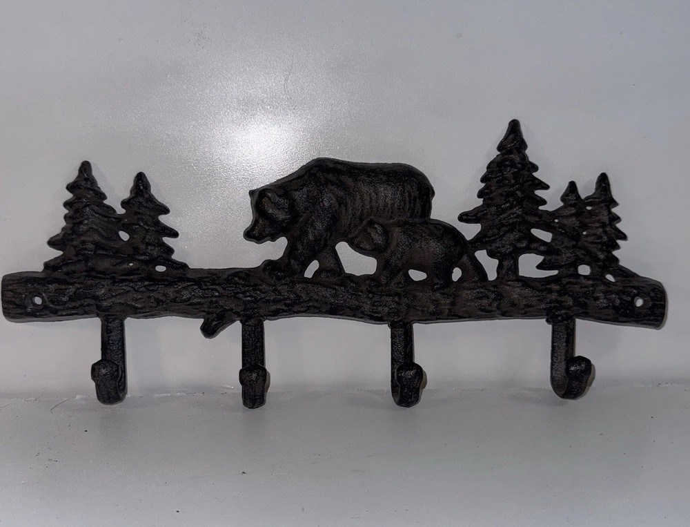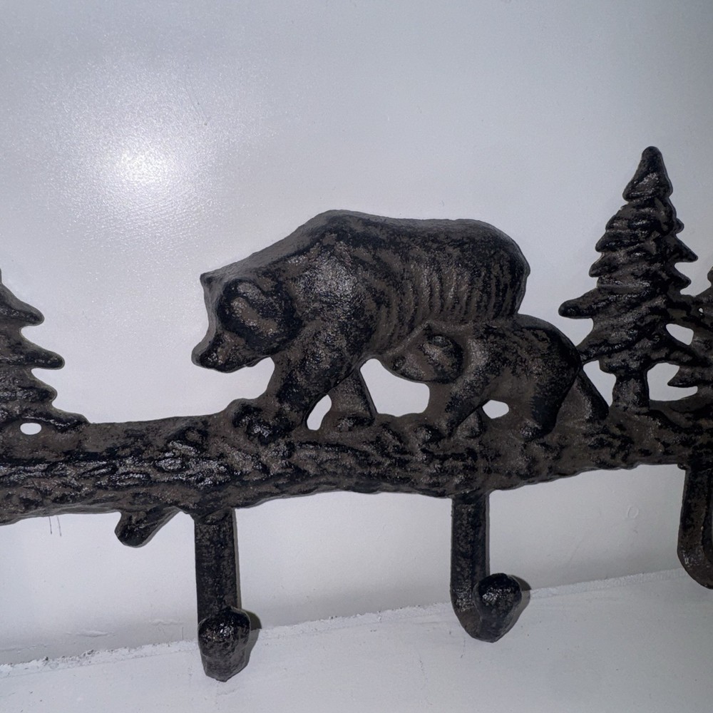 This Cast Iron Bear Wall Hook is a rustic and primitive-looking piece that adds a touch of charm to any room. With 4 hooks for hanging hats, coats, and other items, it is both functional and stylish. The brown painted finish and durable cast iron construction make it perfect for a lodge, cabin, or mountain-themed decor. Measuring 13.5 inches in height and 6 inches in width, this wall-mounted coat and hat rack is a practical and decorative addition to your home organization needs.