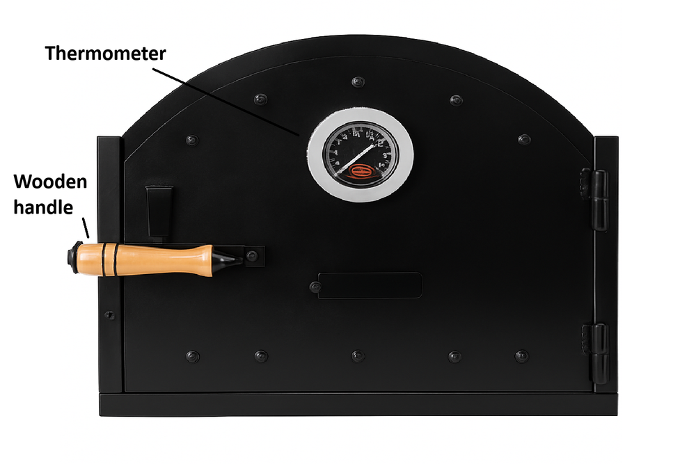 ✅ Description Upgrade your wood-fired pizza oven with this heavy-duty cast iron oven door featuring a built-in thermometer and ergonomic wooden handle . Perfect for maintaining heat and achieving authentic pizza flavors. Durable and stylish, this door ensures even heat retention and cooking precision for your oven. ✅ Key Features ✔ High-Quality Cast Iron – Exceptional durability and heat retention ✔ Integrated Thermometer – Monitor temperature for perfect cooking ✔ Ergonomic Wooden Handle – Safe and comfortable grip ✔ Large Size – 21,7" W x 14" H, fits most traditional pizza ovens ✔ Rustic Black Finish – Complements any outdoor cooking setup ✅ Dimensions & Specs Width: 21,7" (Inches) Height: 14" (Inches) Depth: 3" (Inches) Weight: 31 lbs Material: Cast Iron Color: Black