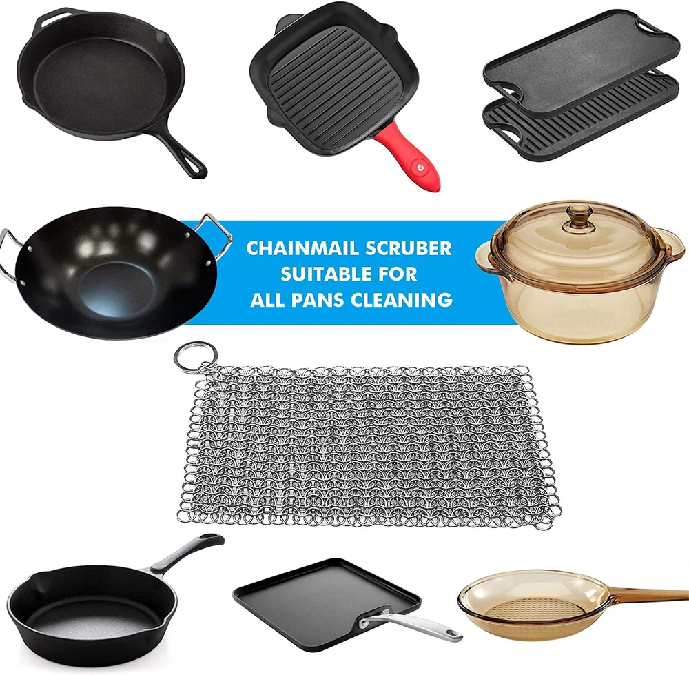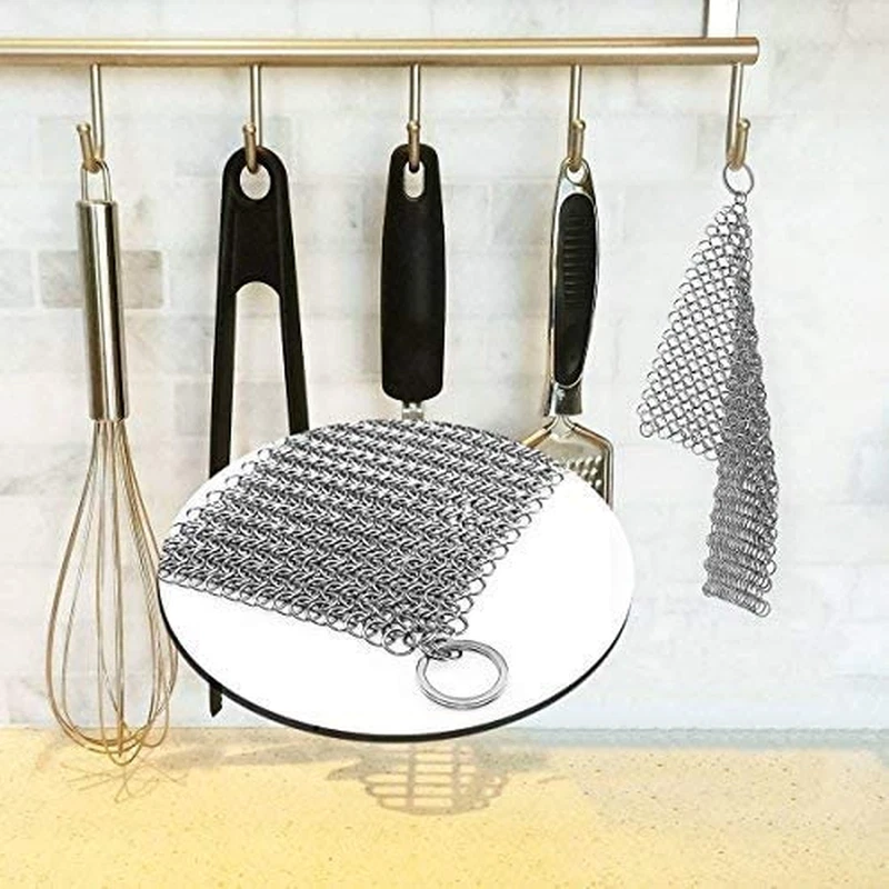 MATERIAL: The cast iron skillet cleaner applies premium grade never rusting stainless steel. It is built with soldered and handmade, which makes it durable and stronger. Boasting unmatched durability and please be assured to use. MULTIFUNCTIONAL: This chainmail multi-purpose scrubber can be ideally used for cast iron pans, skillets, glassware, pizza stones, plates, baking sheets, teapots, cookie sheets, cauldrons, camp chef griddles, tortilla press, waffle makers, pie pans, dutch ovens, griddles, woks, and casserole dishes. EASY TO USE: The Cast Iron Cleaner helps you to effortlessly clean all your cookware pans without stripping away accumulated flavor and seasoning or scratching your pans. Just add some warm water and scrub any residue which is easy and quickly and easily. DISHWASHER SAFE AND EASY TO STORE: Ultra-hygienic and dishwasher safe. To clean, just throw it in the dishwasher. You could just hang it somewhere in your kitchen with that hanging ring on it, no worries about losing it. LIFETIME SATISFACTION GUARANTEE: If you are not satisfied with our products, you may contact us for a refund or a new replacement. Our Excellent customer service will leave you with no worries after you buy it. Product Description Have you ever thought of a pot cleaner that is hygienic and very durable or uses it for lasting a long time? So, you can purchase our product. Our stainless steel Cast Iron cleaner is a good choice for you! Stainless Steel Cast Iron Skillet Cleaner Chainmail Cleaning Scrubber With Hanging Ring for Cast Iron Pan, Pre-Seasoned Pan, Griddle Pans, BBQ Grills and More, Pot Cookware Quality You Can Trust! Our cast iron skillet cleaner applies premium grade never rusting stainless steel. It is built with soldered and handmade, which makes it durable and stronger. Soft enough to prevent scratches, but tough enough to tear through grit. Clean Cookware Easier! The magic of our cast iron cleaner work wonders and make cleaning a breeze through. Scrub any residue with warm water which will release quickly and easily. No soap or harsh detergents needed. Perfect for cast iron restoration as well. Easy To Store And Clean! You could just hang it somewhere in your kitchen with that hanging ring on it, it’s never going to get lost under the kitchen, no worries about losing it. Ultra-hygienic and dishwasher are safe. To clean, just throw it in the dishwasher. Unlike steel wool, we made our chainmail scrubber with 316L stainless steel. 316L is a very special material with low carbon, but durable, corrosion-resistant and heat resistant. And it is popularly used on marine profects. 316L is soft and smooth enough to prevent scratches; meanwhile, it could easily remove residue from the pans and pots. it is built for long lasting use. Multi-functional and could be used to all kinds of cookware. Our chainmail multi-purpose scrubber can be ideally used for cast iron pans, skillets, glassware, pizza stones, plates, baking sheets, teapots, cookie sheets, cauldrons, camp chef griddles, tortilla press, waffle makers, pie pans, dutch ovens, griddles, woks, and casserole dishes. Value Size Square:8×6inch