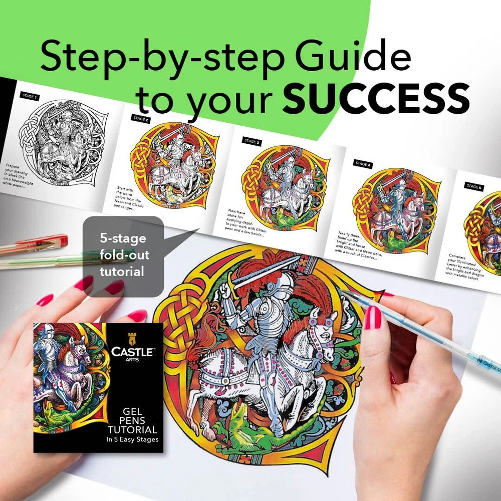 Our bold and beautiful set of 100 Gel Pens combines the smooth ink-flow of the rollerball with the clever mechanism of the ballpoint...allowing the 'ink-credible’ deeply pigmented, luxurious gel ink to flow onto your page with the minimum of fuss.There really are no limits to your creativity with this GEL-TASTIC set of 100 fine tip gel pens. Adorn even the smallest note, memo or To-Do list with a little creative embellishment and help brighten up the world one doodle at a time!The kaleidoscope of colour in our selection, featuring pastels, bright shades, metallic effects as well as special glitter, swirl and neon gels will delight coloring fans of all ages. They are so comfortable to use that we think they will struggle to put them down (so please be patient!). And for the detailed artists among us the fine tips will allow the addition of stunning intricate design elements.And with their non-toxic, acid-free credentials, these Gel Pens get the Castle Arts seal of approval and we can confidently recommend them for family crafting activities and art projects on a range of materials including smooth surfaces. You can even paint with them.And don’t forget our COLOR HAPPINESS GUARANTEE. At Castle Art Supplies we are always confident to stand behind our brand and offer our exclusive 'Color Happiness Guarantee’ - if you're not happy with our Gel Pens please let us know and we will be happy to replace or refund them. BOX OF DELIGHTS Open up the gift-worthy box to reveal the ultimate, variety-packed gel pen set, beautifully organized in 4 fold-out, stand-up sections; makes choosing the purpose-perfect pen easy and fun. DESIGNED TO INSPIRE Curated by in-house artists to deliver the dazzling spectrum of colors and effects - glitter, swirl, neon, pastel, metallic – craved by colorists, crafters, card creators, note makers, doodlers and every artist. SENSATIONAL TO USE Rejoice in the comfortable feel of the pen as you apply intensely pigmented ink – pure, non-toxic, non-smear, quick drying - flowing smoothly from the fine-point tip to add extra detail or finishing flourish. BUILD YOUR SKILLS Our unique fold-out tutorial enables you to make the most the gel pens’ creative capabilities by reproducing the intricate illustration on the box in five easy-to-follow steps. TESTED, TRUSTED AND GUARANTEED Tested by our studio experts to beat competitors. Trusted by ultimate judges – our 2.5 million customers worldwide; backed by unique money-back-PLUS guarantee.
