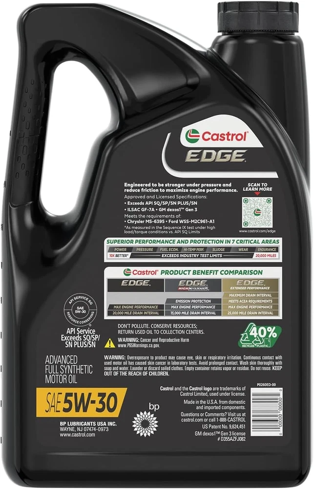 Castrol EDGE 5W-30 Advanced Full Synthetic Motor Oil, 5 Quarts 3X Stronger than the leading full synthetic* 10X Better high stress performance** 20,000 miles between oil changes*** *Viscosity breakdown as measured in Kurt Orbahn test on 5W-30 grade **As measured in Seq IX test under high load/torque conditions vs. API SQ test limits ***Or one year, whichever comes first Approved and Licensed Specifications: Exceeds API SQ/SP/SN PLUS/SN | ILSAC GF-7 | GM dexos1 Gen 3 Meets engine test requirements of Chrysler MS 6395 | Meets Ford WSS-M2C946-B1 | Meets Ford WSS-M2C961-A1 Shipping We offer FREE shipping on all orders! We ship within Three business days of payment, usually sooner. We use a selection of shipping services such as UPS, FedEx, USPS etc. We only ship to the lower 48 states, no APO/FPO addresses or PO Boxes allowed. Local pickups and combined shipping options are not provided at this time. Return You can return a product for up to 30 days from the date you purchased it. Any product you return must be in the same condition you received it and in the original packaging. Please keep the receipt. Payment We accept payment by any of the following methods: PayPal Please pay as soon as possible after winning an auction, as that will allow us to post your item to you sooner! Feedback Customer satisfaction is very important to us. If you have any problem with your order, please contact us and we will do our best to make you satisfied. Contact Us If you have any queries, please contact us via ebay. We usually respond within 24 hours on weekdays. Please visit our eBay store to check out other items for sale! Thank you for shopping at our store.