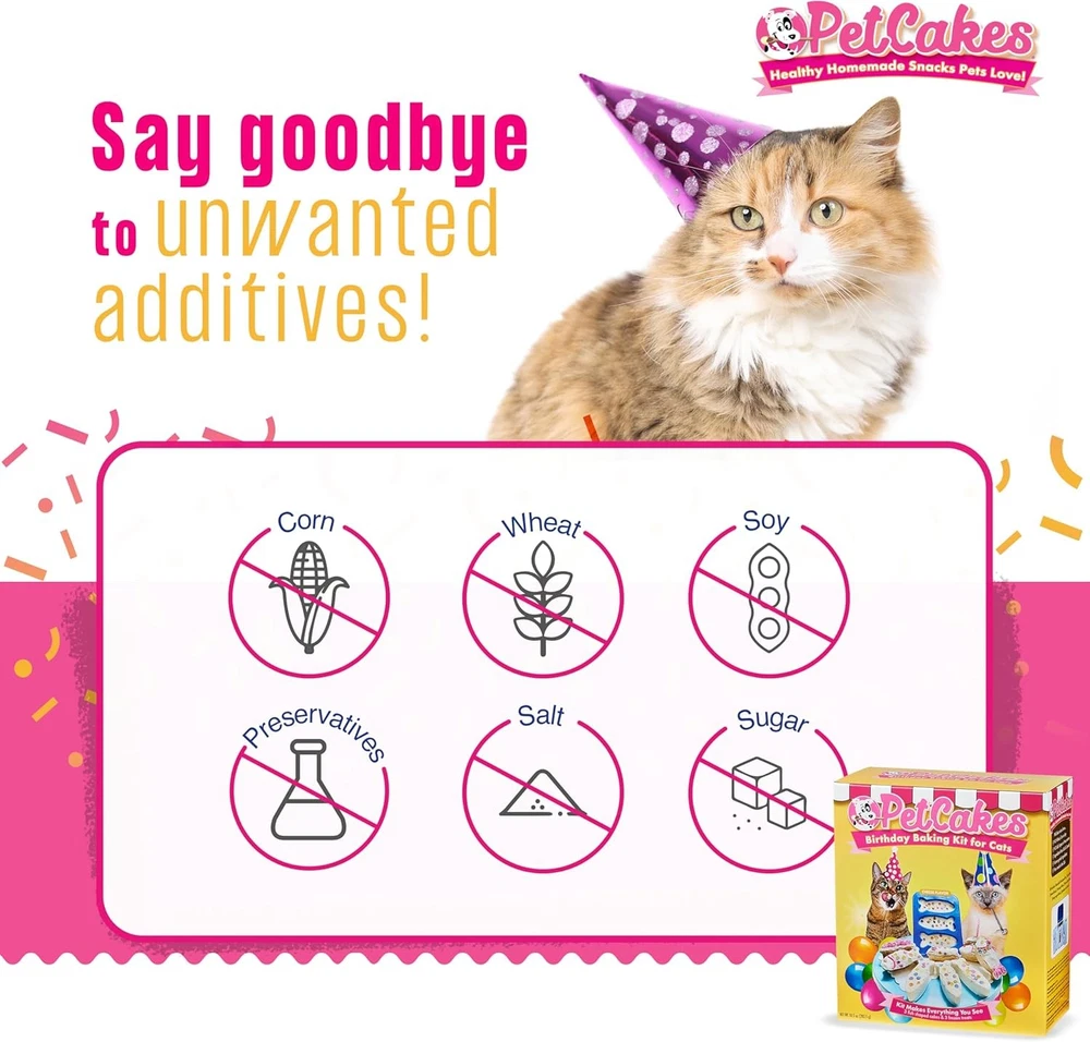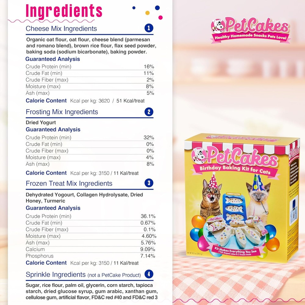 Birthday Baking Kit for Cats- Makes 3 Frosted Fish 14.3 Ounce (Pack of 1) Product Details Item Weight: 0.634 ounces Manufacturer: PetCakes Item Package Dimensions L x W x H: 7.28 x 6.73 x 3.31 inches Brand Name: PetCakes Directions: See Image Label Size: 14.3 Ounce (Pack of 1) Age Range Description: All Life Stages Number of Items: 1 Breed Recommendation: Any Specific Uses for Product: Appetite Stimulation Package Dimensions : 7.28 x 6.73 x 3.31 inches; 0.63 ounces Manufacturer : PetCakes Brand: PetCakes Flavor: Cheese Age Range (Description): All Life Stages Item Form: Powder Specific Uses For Product: Appetite Stimulation Cat cake mix & frosting kit for a tasty birthday cake with ice cream - easy and fun to make at home with your kids! Add water to the cake mix & microwave in the fish shaped cake pan - comes with sprinkles & a candle! Add water to the cat ice cream mix & freeze for just three hours - top with their favorite treats. Quality, human-grade ingredients - free from wheat, corn, and soy. No added sugar, salt or preservatives. 100% USA made - We are proud to make our natural cat treats with quality ingredients here in the USA.