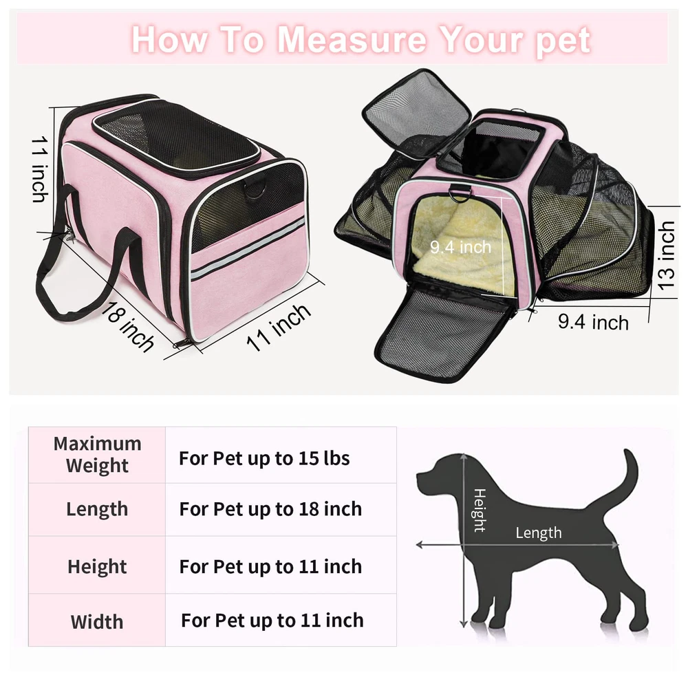 EXPANDABLE SOFT-SIDE CARRIER: Please measure pets before purchasing. pet carrier normal size is 18"Lx 11"Wx 11"H, expandable size is 18" Lx 29.8"W x 11"H by expanding the 2 mesh windows. Fits pet up to 18”L*10”W*10”H, max load of 15lbs (The dogs can not exceed 12 pounds). Please do not choose a pet carrier based on weight, please refer to your pet's length and height to choose the size of the pet carrier (product description)then Make sure pets don't exceed the maximum weight limit. DURABLE MATERIAL: Dog airplane carrier approved designed with microfiber frame prevents the top from sagging, keeping solid and stable even after total expanded. No collapse or deform like other pet travel carrier. EASY to CARRIER: The cat carrier designed with a hard PP pad into bottom, help to hold and increase load beaning, avoid deformation when carry on the carrier. The pad made of suede and polyester, washable and easy to clean.Mesh cloth increase ventilation and decrease anxiety for traveling. Carry the expandable carrier on airplane, car, by hand or shoulder. AIRPLANE APPROVED: Dog travel carrier compliance with airline standard size, fit under the front cabin seat of most airline carriers. Every airline has a specific set of rules and regulations, please contact with airline before flying with your pet. Tips: The pet carrier bag has been upgraded about color, the edge of the previous style is purple, and the edge of the new style is blue. The size and function of the new pet bag remain the same, both colors may be shipped randomly. PLEASE NOTE INTERIOR SIZING & PET MEASURING GUIDELINES BEFORE PURCHASE : PLEASE KEEP IN MIND that we show the exterior dimensions as well as approximate interior dimensions to best portray the usable interior space for your pet. The interior space will be less than exterior due to the fabric thickness and plush faux fleece padding.NOTE: Not suitable for large sized dogs.