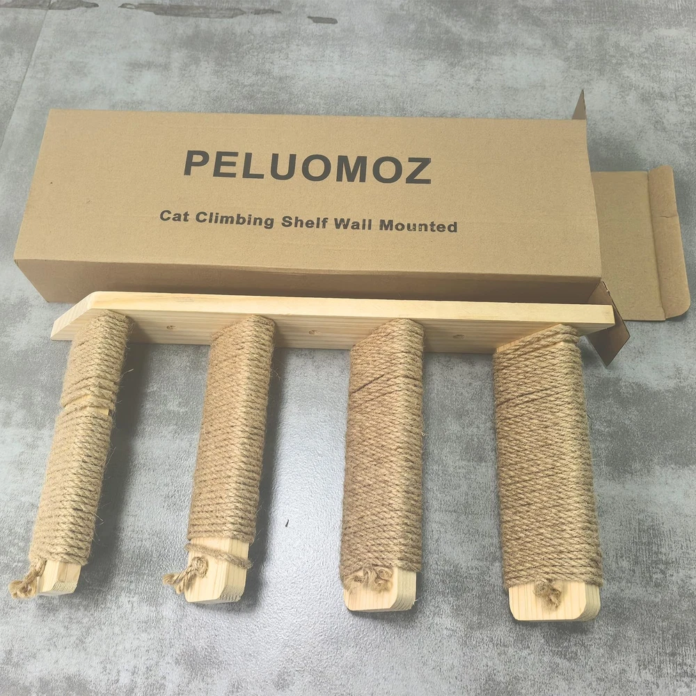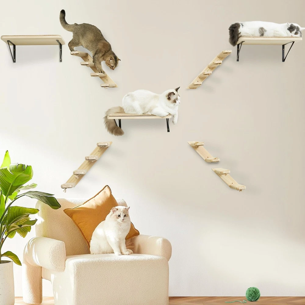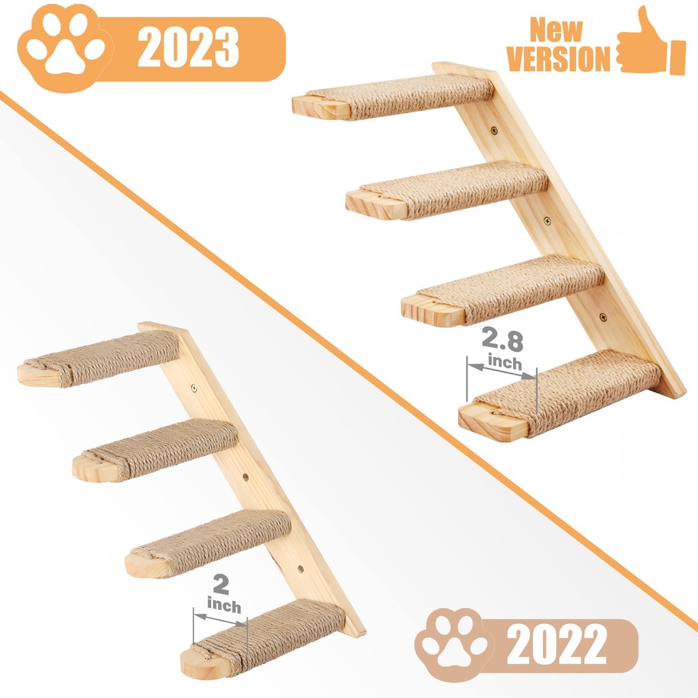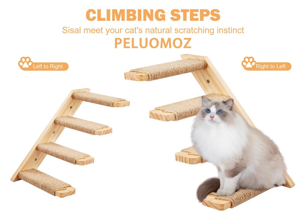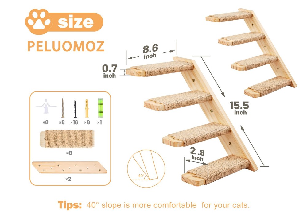 Cat Climbing Shelf Wall Mounted, 8 Steps Cat Stairway with Sisal Rope Scratching for Cats Perch Platform DIY CAT PLAYGROUND - Our cat stairs and cat shelf suitable for large cat and kitty. You can create a climbing perch with our wall-mounted cat shelves. This cat climbing shelf family set is ideal for cat climbing, sleeping and exercise with cat furniture. Packing includes: 1P 4-step stair & 2PCS wall cat shelves. PERSONALIZED DESIGN & SAVE SPACES - Reversible cat stair design allows for flexible LEFT TO RIGHT or RIGHT TO LEFT mounting on any wall. The cat wall perch shelf is in original wood color and blends perfectly with home decor. Cat wall furniture can help turn your house into a chic home. Stair scratcher shelves provides not only save space but also a place for cats to lounge and turn it into a cat wall scratcher, cat bed or cat house. EASY INSTALLATION - Simply drill holes and secure the shelves with screws. Please ensure that your walls are suitable for wall-mounted products before installation. STURDY AND FIRM & CAT'S LOVERS - Our jute cat scratching shelves made of natural pine and swordsy rope, providing a healthy and attractive scratching and playing surface for cats. It's safe to your cat when you use our cat tree shelves. Tips: natural wood may have slight variations in appearance. 100% SATISFACTION - If you encounter any issues with the product, such as misaligned guide holes, within 90 days of purchase, please through and we'll resolve the issue within 48 hours.