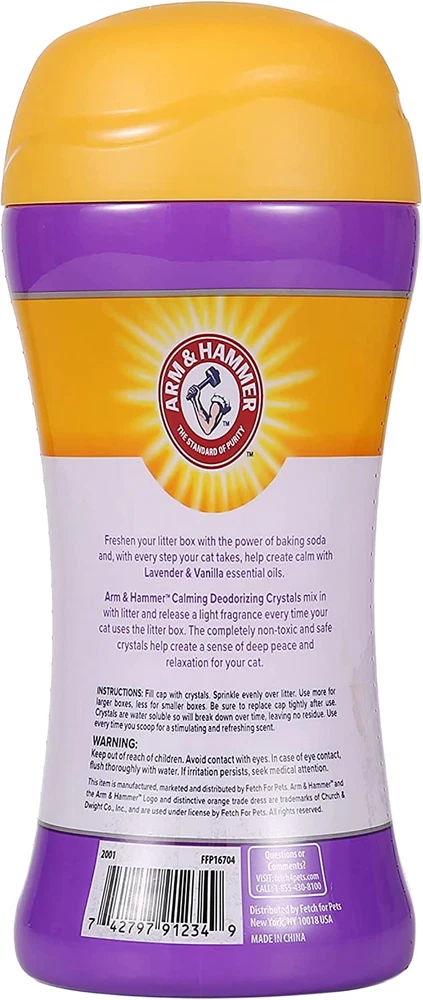 ODOR NEUTRALIZER CAT LITTER CRYSTALS – Arm & Hammer Cat Crystals work as a powerful scented cat litter odor eliminator to control unwanted cat smells, keeping your kitty litter box and home fresh and clean for your cats with zero mess. ARM & HAMMER BAKING SODA – Featuring the trusted Arm & Hammer Baking Soda, this cat crystal deodorizer neutralizes cats litter odors with a blend of essential oils, leaving your home fresh. It's perfect for keeping your pet’s litter box free from smells. EASY TO USE – Sprinkle these dissolvable scented cat litter crystals over the kitty litter box to easily control odors and maintain a clean, fresh environment for your cat litter. No additional cleanup is needed, and it helps prevent lingering pet smells. DISSOLVES OVER TIME – Arm & Hammer cat crystal deodorizer slowly dissolves over time, absorbing and eliminating pet odors in your cats litter. With no need for extra cleanup, your kitty litter box remains tidy and free of lingering smells. CALMING SCENT – The calming combination of lavender and vanilla in this scented cat litter deodorizer helps relax pets while neutralizing odors in cats litter. It leaves the room smelling fresh, perfect for both your home and pet environment. Arm & Hammer Deodorizing Cat Litter Crystals are a convenient, easy, and fresh way to help maintain your cat litter box. Cat litter crystals are the perfect addition to any litter box and are sure to make a noticeable difference in your pet household. Litter box crystals work as litter box deodorizers to create a wonderfully fresh and hygienic litter box that conceals odors. The Arm & Hammer baking soda ingredient mixed with essential oils helps with odor control while it works. These cat litter crystals will ensure that your litter box and the area around it always smells fresh. Arm & Hammer Deodorizing Cat Litter Crystals come in calming, restoring, and stimulating scents to instantly freshen your home with pets. Best of all, the cat litter deodorizing crystals dissolve over litter so you don't need to worry about cleanup!Crystal litter odor eliminators for home cat litter boxes are great for helping neutralize cat odors in the home. This Arm & Hammer baking soda product helps with cat odors in and around the litter box. In addition to using these cat litter deodorizing crystals, some pet parents also choose to use odor neutralizing gel beads like Arm & Hammer Pet Scents for the home. Odor beads are different from cat litter crystals for cat litter odor elimination. A cat litter odor eliminator like this one can go in all types of litter boxes. Find the best scent for your needs with Arm & Hammer for pets.YOUR SATISFACTION IS OUR PRIORITY. For any questions or feedback, please reach out to us at Fetch for Pets.