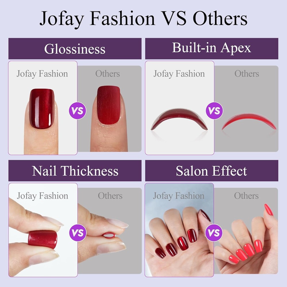 【New Upgraded Salon Effects】The set contains 5 newly upgraded salon effect short press-on nails, a total of 120 pcs winter style 3D light-chasing cat's eye nails, dark red/dark purple/dark blue, brown-red and olive green with chameleon effect, each color is very special, velvety texture of fine flashes create luxurious charm, very suitable for various winter combinations. 【High Quality & Durable】Full coverage false nails are made of high quality acrylic material and soft gel, the nail tips are elastic and durable, not easy to break. The surface of the fake nails is coated with a high-gloss protective gel, which is not easily worn out even after repeated use. 【Natural & Comfortable】Jofay Fashion acrylic nail tips are of moderate thickness, and the tapered cuticle design fits the edge of the nail better, giving a comfortable and natural effect without placing a heavy burden on the nail bed. 【Press On and Go】The fake nail set is small, lightweight and easy to carry, so you can quickly change your nails anytime, anywhere, whether you are traveling or on a business trip. Reusable short glue on nails are a great choice for travel/home manicure. 【Perfect Gift for Women】 Gel nail press ons are very suitable for many social occasions such as weddings, proms, dates, and also suitable for Valentine's Day, Halloween, Christmas and other festivals. These holiday nails are the perfect gift for girlfriends, wives, women and girls.