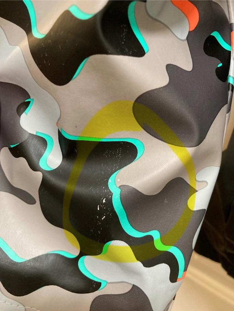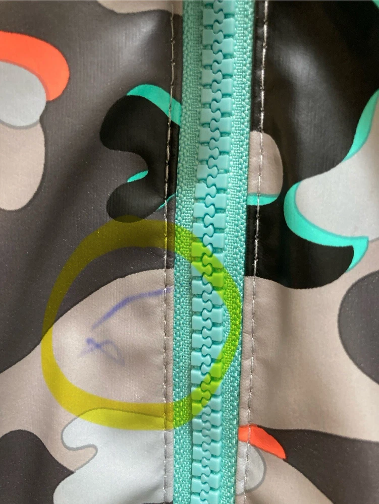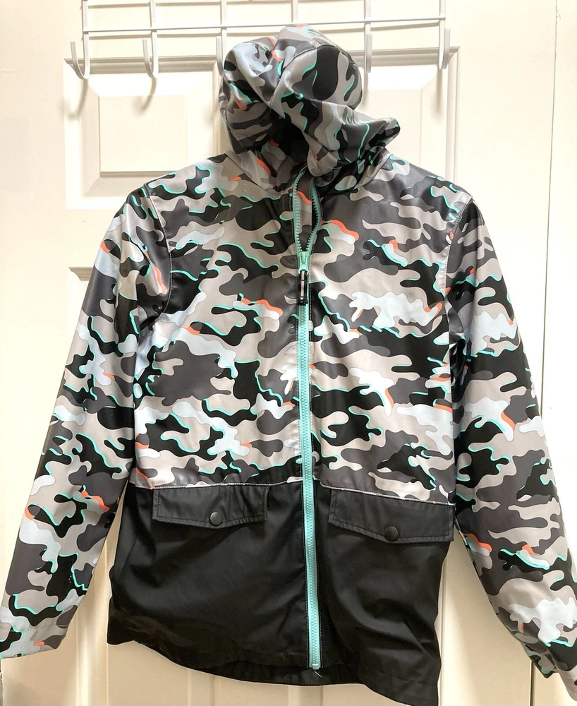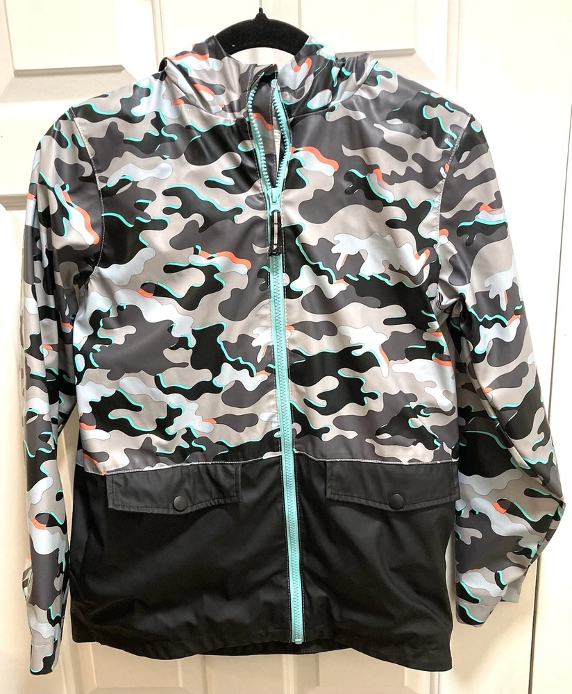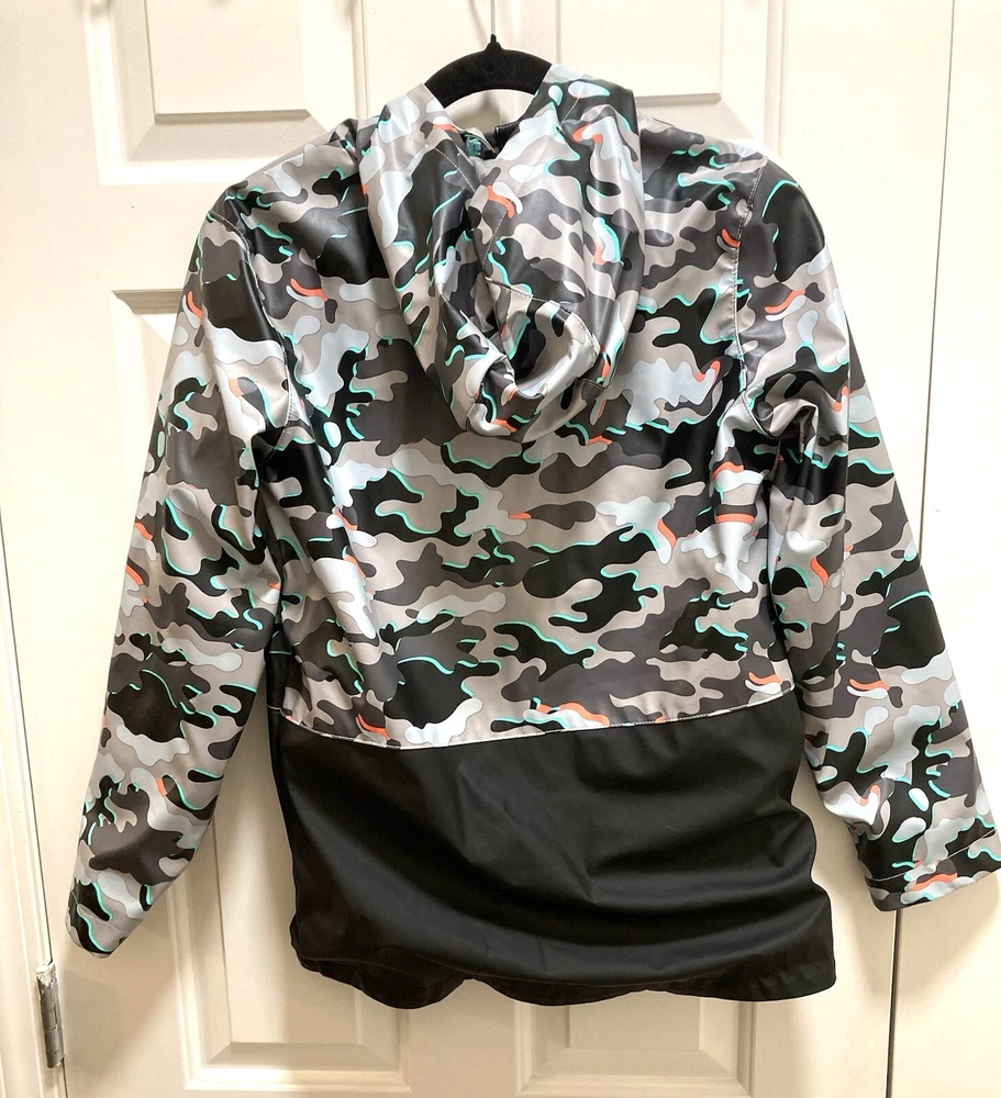 CAT & JACK BOYS Camo Hooded Rain Jacket Size Large 12/14 Measurements approx. Pit-Pit: 18 inches Length: 24 inches **FLAWS** (see last 3 pics) There are 2 very small fading spots from wear and washing. There is an ink pen mark on the front. NO rips or tears. Other than the 3 small spots the rain jacket is in great preowned condition.