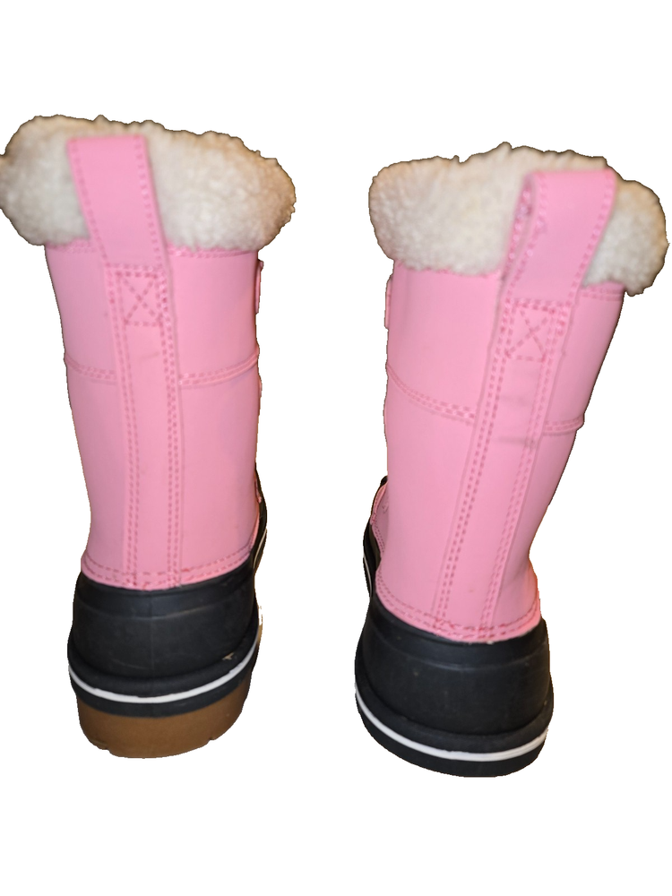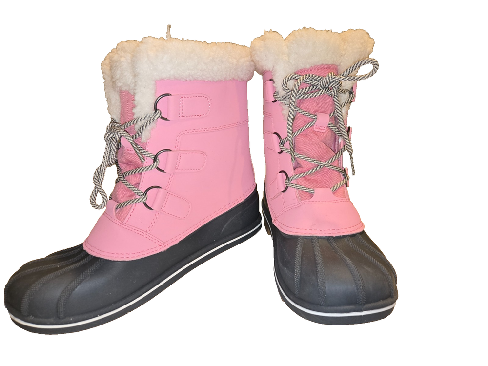 The Cat & Jack Pink and White Girls Snow Boots in size 5 are stylish and functional winter boots designed for young girls. With a round toe shape and flat heel, these snow boots provide moderate cushioning and are water resistant, making them perfect for snowy days. The faux fur lining and two-tone color add a cute and playful touch, while the leather flocking outsole ensures durability and traction for walking activities. These mid-calf boots from Cat & Jack are ideal for the winter season.