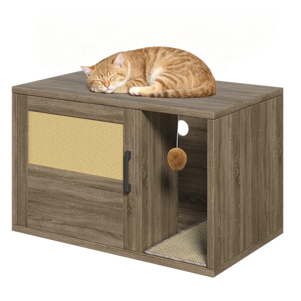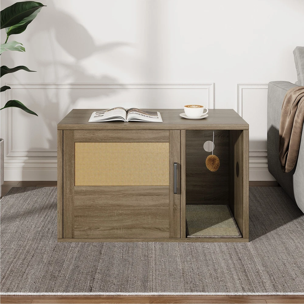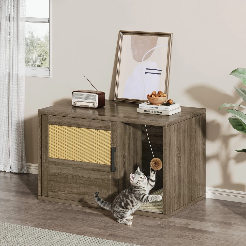 Feature: 1. Multifunctional Design: Used as a litter fence or house for your cat. It can also serve as a stylish side table, suitable for placing books, crafts, or other items, combining functionality and style seamlessly. 2. Odor Control: This cat litter box furniture is designed to provide your cat with a private metabolism space, helping to control odors and suitable for most litter boxes, ensuring a fresher home environment. 3. Entertainment Needs: The entrance of this enclosed cat litter box features a scratching pad, allowing cats to enjoy their nature scratching instinct as they enter. 4. Sturdy and Stable: Made of high grade chipboard and premium metal frame, the cat litter box is more durable and secure, ensuring high safety standards. 5. Easy to Assemble: Clear instructions, assembly tutorials, and all necessary tools are included in the package for easy installation in a short amount of time, with minimal assembly difficulty. Specification: Item Type: Cat Litter Box Enclosure Size: Approx. 80x50x50cm / 31.5x19.69x19.69in Material: Particle Board Door Number: 1 Package List: 8 x Boards 1 x Pad 14 x Accessory Pack 1 x User Manual Note: