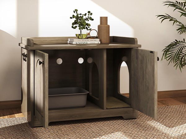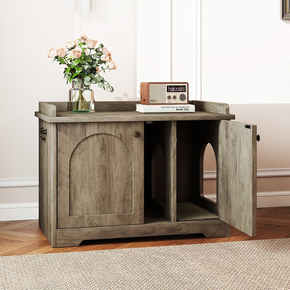 Feature: 1. PET FRIENDLY DESIGN: This cat litter box enclosure provides a private bathroom space for your feline friend. Add a litter box inside and create a cozy, quiet corner with a cat bed and toys, giving your kitty the excellent place for napping and relaxation. 2. ODOR CONTROL: Designed to offer your cat a dedicated area for their needs, this litter box furniture helps suppress unpleasant odors. It fits most litter boxes and keeps your home smelling fresher, while also preventing litter spills and messes. 3. MULTI FUNCTIONAL: This cat house serves dual purposes, not only is it a litter box barrier, but it also functions as a cat house. With its stylish furniture aesthetics, it can easily double as a side table or coffee table next to your sofa, providing a practical place for books, decor, or other items. 4. STURDY AND STABLE: Crafted from high strength boards, this pet box enclosure is both robust and enduring, ensuring safe usage for your pets. Its double cabinet doors allow for easy access when refilling cat food or cleaning up, enhancing convenience for pet owners. 5. COMPREHENSIVE KIT: The kit includes clear instructions, all necessary tools, and hardware for easy assembly. This wooden cat house transforms untidy areas into neat, cozy spaces, providing your cat with a private place to do their business without compromising your home's aesthetic. Specification: Item Type: Cat Litter Box Enclosure Furniture Size: Approx. 80x56x50cm / 31.5x22.05x19.69in Material: Boards Doors: 2 Package List: 13 x Boards 1 x Scratching Pad 13 x Accessories Pack 1 x Instruction Manual Note: