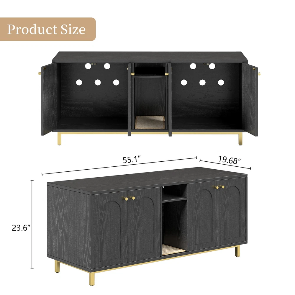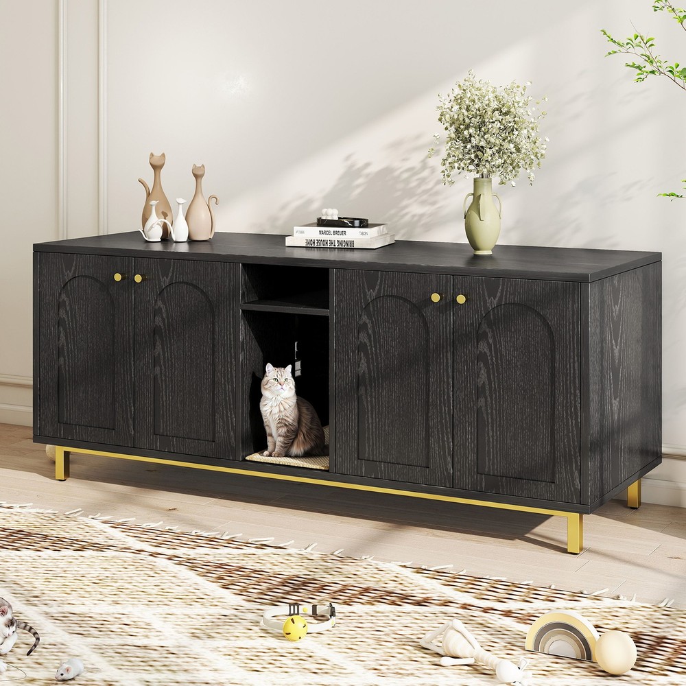 Feature: 1. Spacious Room Design: Our luxurious double cat room design offers ample space for two cats to comfortably use at the same time. This spacious design ensures that both of your furry friends have enough room to feel relaxed and secure. 2. Integrated Scratching Pad: This litter box is equipped with a built in scratching pad, allowing your cats to indulge in their nature scratching instincts as they enter. 3. Multifunctional Furniture: Our large wooden cat litter box serves a dual purpose as a cozy cat house and a stylish piece of furniture. It prevents dogs from accessing the litter area while seamlessly blending in with your home decor, functioning as a TV stand or side table. 4. Magnetic Double Door Design: The innovative magnetic double door design simplifies daily cleaning and litter replacement. The thoughtfully engineered entry mechanism allows your cats to enter with ease, while ensuring proper ventilation and ample light inside. 5. Rugged And Easy To Clean: Made from particle board, this enclosure is built to last and withstand everyday use. The ten small holes at the back effectively eliminate odors, while the easy to clean wooden surface ensures that maintenance is quick and efficient. Specification: Item Type: Cat Litter Box Enclosure Size: Approx. 140 x 60 x 50cm / 55.12 x 23.62 x 19.69in Color: Black Material: Particle Board Doors: 4 Package List: 14 x Boards 2 x Iron Bars 2 x Iron Frames 1 x Scratching Pad 18 x Accessory Packs 1 x Base Fixing Device 1 x Manual