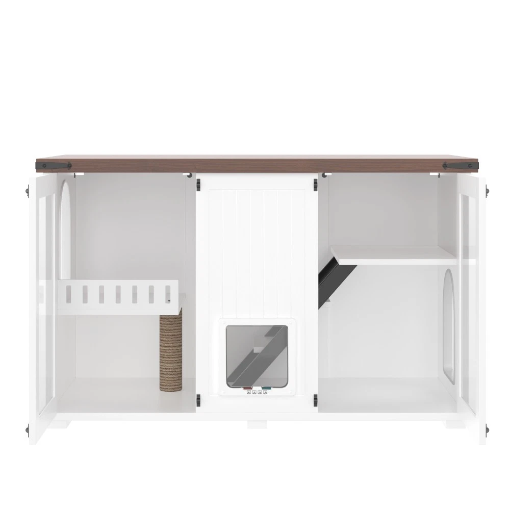 47.25" Large Cat Litter Box Enclosure with LED Light, Hidden Litter Box Furniture, Cat House with Stairs and Scratching Post, White ✨ Premium Cat Litter Box Enclosure for Large Cats | Multifunctional Hidden Furniture | 1-Year Warranty & 30-Day Free Return ✨ Tired of unsightly litter boxes ruining your home decor? Fed up with odors and dog distractions? Our 47.25" Large Cat Litter Box Enclosure is the perfect solution to blend pet needs with your living space style. Designed for large cats (41-70 lbs), this all-in-one hidden litter box furniture combines odor isolation, cat play space, and home storage—making it a must-have for cat parents who value both functionality and aesthetics! 📌 Key Specifications Pet Compatibility : Suitable for Large Cats (41 - 70 lbs) Material : High-Quality Acrylic & Engineered Wood (PB Board) – Sturdy & Durable Color : Sleek White – Matches Any Home Decor Assembled Dimensions : 47.20"L x 22.00"W x 27.70"H | Weight: 72.69 lbs Packaging Dimensions : 52.50"L x 25.25"W x 7.00"H | Weight: 76.06 lbs Load Capacity : Top Surface Supports Up to 110 Lbs 🌟 Why Choose Our Cat Litter Box Enclosure? ✅ Multifunctional Design for Home & Pet Accommodates 1-2 litter boxes, effectively isolating odors and preventing dogs from disturbing your cat during use. The large top surface doubles as a chic side table or coffee table—perfect for placing cat food, toys, books, or decorative items. Keep your living room neat, organized, and stylish without sacrificing pet comfort. ✅ Thoughtful Multi-Area Layout This hidden litter box furniture features a well-divided structure: 2 spacious upper platforms for cat beds or toys, a lower compartment for the litter box, and a middle area with a scratching post and stairs. Your feline friend can play, exercise, rest, and take care of business all in one place—满足ing their natural instincts and needs. ✅ User-Friendly Details for Convenience Equipped with a high-definition acrylic door, you can easily monitor how often your cat uses the litter box, ensuring timely cleaning. The built-in soft LED lighting allows your cat to move around safely and comfortably even at night, no more stumbling in the dark! ✅ Smart 4-Mode Locking Door Customize your cat's entry and exit with 4 adjustable modes: No Entry & No Exit, Both In & Out, Only In & No Exit, Only Out & No Entry. Perfect for various scenarios—whether you're cleaning the litter box, feeding time, or letting your cat roam freely. Manage your pet effortlessly with maximum flexibility. ✅ Durable & Easy to Maintain Crafted from high-quality PB board, this cat cabinet is sturdy and wear-resistant, built to last. The transparent acrylic door is shatter-resistant and lightweight for easy opening. Cleaning is a breeze—wipe common stains with a damp cloth, and open the cabinet door to quickly access and clean the litter box. All boards and components are numbered for hassle-free assembly. 🛡️ Trusted After-Sales Guarantee We stand behind our products! Enjoy 1-Year Quality Warranty for this cat litter box enclosure—if you encounter any quality issues within 1 year of purchase, we'll provide free replacement parts or repair services. Plus, 30-Day Free Return Policy —if you're not satisfied with your purchase for any reason, you can return it for a full refund within 30 days, no questions asked. 📦 Package Includes 1 x 47.25" Cat Litter Box Enclosure (White) | All Assemble Components | Detailed Instruction Manual Upgrade your home and cat's lifestyle with this versatile, stylish, and practical litter box enclosure. Order now and give your feline friend a private, comfortable space while keeping your home clean and elegant! Note : Designed for indoor use. Suitable for 1-2 large cats or multiple small cats. Litter box not included.