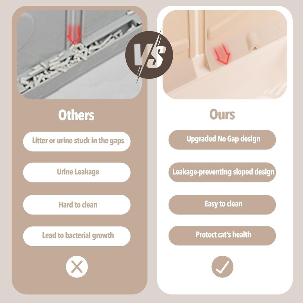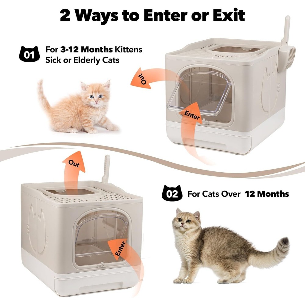 About this item Sloping Design No More Urine Leakage: Our cat toilet's sloping design and tight connection gap guide urine flow to the litter, preventing any leakage Drawer Design Effortless Cleaning: The litter box with pull-out drawer structure makes the kitty litter tray easy to clean and exchange cat sand, saving you time and effort 2 Way Door Front or Top In and Out: With a simple slider, the litterbox can be turned into a one way door for front entry and top exit. The 0.3inch filter holes at the top prevent litter from splashing around Large Space Comfortable Environment: Our kitten litter box has a spacious and deep interior (19"x15"x15.6" LxWxH), providing a comfortable environment for cats under 16lbs to turn around easily