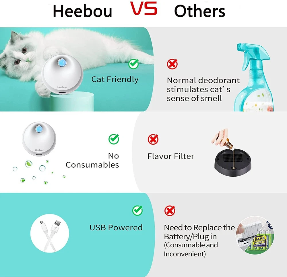 Smart Cat Litter Deodorizer Cat Litter Deodorizer is a new mode of odor eliminator in the market, which is using new ion decomposition technology to eliminate and control odor up to 99%. It’s specially designed for cats, puppy or any small spaces, like Cat Litter Box, dog crate. It won’t generate any harmful or unwanted smells. Let’s create a better environment for your pets and a fresh home!! cat litter deodorizer is different from scented cat litter, deodorant powder or neutralizer, it is not only removes bad odor, refreshes the air but also won’t generate any toxic or unpleasant smells which is very friendly and safe for you and your pets. How to use it? 1. Turn on the power switch on the back of the cat litter deodorizer. The blue light is on, which indicates smart monitoring mode. When the blue light is blinking, it indicates deodorizing and dust reduction mode. 2. There is an Caps with double-sided tape on the back of the odor eliminator. Peel the protection film off and press the adhesive side to the surface you desire. 3. When the battery is running low, a red light will be on. Turn the deodorizer counterclockwise to detach and charge it with the USB cable. 4.When the cat approaches the cat box deodorizer, it will automatically turn off to avoid disturbing or scaring your cat. When the cat leaves, it will automatically turn on. Powerful Deodorizing Function: litter deodorizer has the new technology of deodorization, which will remove over 99% of odor from the litter. Once cat litter deodorizer is turned on, its sensor continuously monitors the usage of the litter box until the battery runs out and automatically eliminates odors to ensure a fresh scent around the litter box. (The odor may not disappear completely on the first day of use, but after 2-3 days, and you will feel the significant difference.) 100% Cat Friendly & Fragrance-free: litter box deodorizer releases deodorizing and dust-reducing substances(negative ion), its emissions are completely within the standard range. And completely friendly for both you and the pets. Moreover, the deodorizer is equipped with a sensitive biosensing system, when the cat approaches the deodorizer, it will automatically turn off and automatically turn on when the cat leaves. No worries for your meow anymore! USB Charged Battery: cat odor eliminator requires no replacement of filter. Our cat litter box deodorizer is powered by low wattage(about 1 watt). Our cat litter box deodorizer was built in 4000mAh high-performance lithium battery and recharged by USB cable(included) It can work up to 7 days on a single charge. (Ultra-quiet)The noise reduction design keeps the noise from the device under 20dB so your cat will not be disturbed. Multipurpose Use: litter box deodorizer is designed for small spaces wherever smells are from places like cat litter boxes, pet pads, shoe cabinets, kitchen, bathroom, wardrobe, other animals' living area etc. Place our litter box deodorizer in or close to the smelly area to maintain a fresh-scented home for you and the pets. For better odor control, place the deodorizer in litter box or closer to the box. Sturdy Snap Design: The litter deodorizer uses a heavy-duty Caps with double-sided tape on its snap cap back to hang on any surface you like, so you could easily snap the deodorizer into the cap by turning it but the cat couldn’t scratch it off. If you have any issues with our product, please feel free to contact us via Amazon message. We will do our best to solve the issue within 24 hours during business hours.