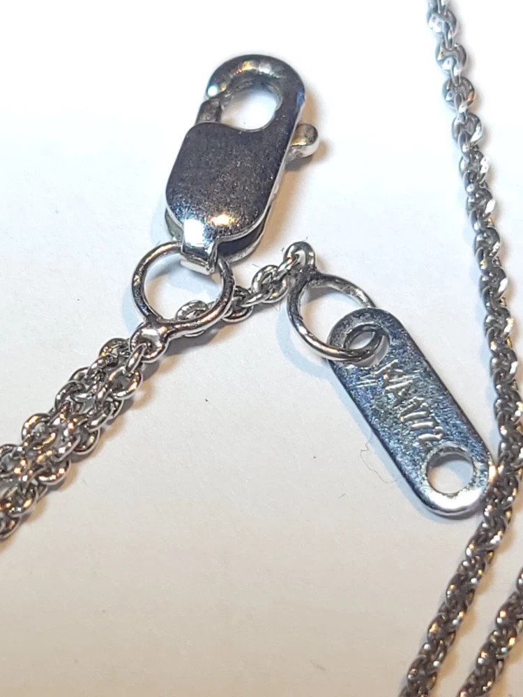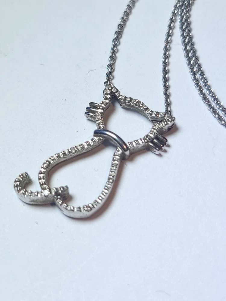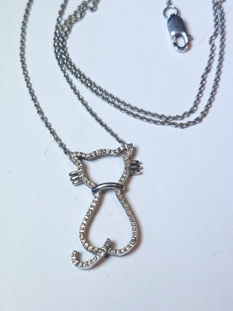 This necklace features a charming cat-shaped pendant made of sterling silver. The pendant is adorned with tiny sparkling diamonds, adding a touch of elegance to the piece. The necklace comes on an attached 18.5" chain and features a lobster closure marked "925 Italy. " This cat necklace is a stylish and whimsical accessory for any cat lover or animal enthusiast looking to add a playful touch to their outfit.