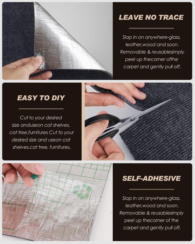 78.7"x15.8" Cat Scratch Mat,Trimmable Self-Adhesive Carpet,DIY Climb Cat Scratcher for Cat Couch Furniture or Wall Protector,Covering Cat Tower,and Replacement Pads (Dark Gray) 【Generous Size】 This 78.7"x15.8" cat scratching mat offers wide coverage for cat tree shelves, wall steps, and sofas, protecting furniture from cat claws. 【Trim-to-Fit Design】 Customize with scissors to fit cat trees, sofas, or wall steps, making it a versatile cat scratch furniture protector for any space. 【Self-Adhesive Convenience】 Peel and stick with eco-friendly adhesive backing for easy, long-lasting installation. Bonus strips and screws secure it to all surfaces. 【Scratch & Claw Resistant】 Made of durable, non-toxic material, it satisfies cats' scratching needs while protecting sofas, walls, and cat trees from damage. 【Multi-Purpose Defender】 Protects various furniture like cat towers, leather sofas, and glass tables, blending seamlessly into your décor. 【Post-Saving Solution】 Protects and extends the life of your cat tree by absorbing scratching damage, offering an affordable way to refresh worn furniture.
