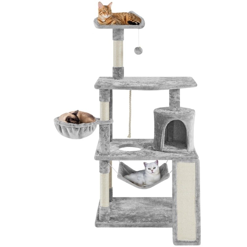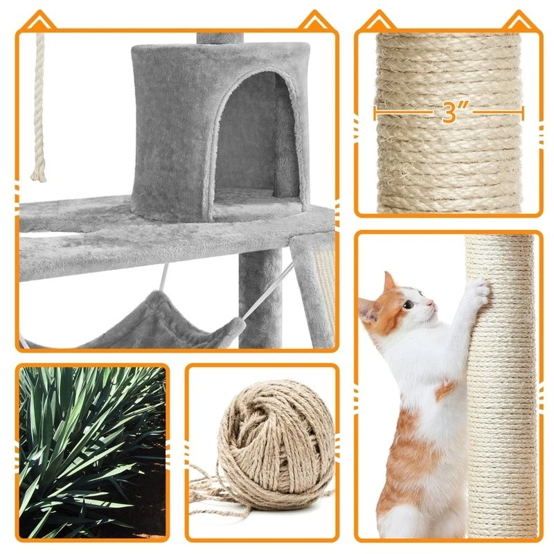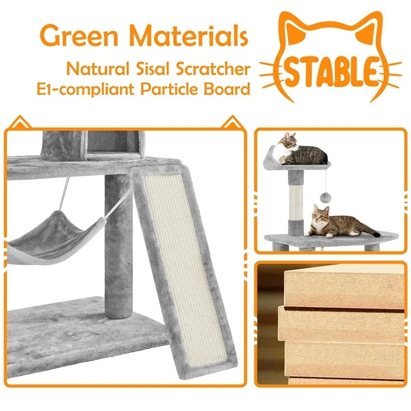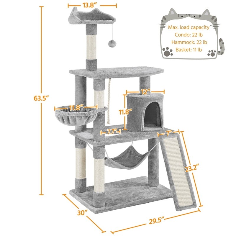 You may also like 3-Tier Cat Tree Scratching Post Condo Perch W/ Toy Indoor Pet Playground New 67.08 USD 70.61 USD Free shipping 5% off 3 Pack Cat Scratcher Bowl Eco Friendly Healthy Nail Care Durable Lightweight New 52.9 USD 55.68 USD Free shipping 5% off Multi-Level Cat Tree W/ Cozy Perches & Sisal Scratching Posts Medium Cats New 91.07 USD 95.86 USD Free shipping 5% off Cat Scratcher Durable Corrugated Cardboard Dachshund Natural Catnip Safe Cats US 27.18 USD 28.61 USD Free shipping 5% off Wooden Cat Tree Tower W/ Multiple Levels Condo Scratching Post & Perch New 63.57 USD 66.92 USD Free shipping 5% off Multi-Level Cat Tree W/ Condo Veranda Bench Mini Perch & Scratch Posts New 116.57 USD 122.71 USD Free shipping 5% off 3-Level Cat Tree W/ Scratching Posts Condo Plush Toy & Exercise Platform New 44.78 USD 47.14 USD Free shipping 5% off Cat Scratching Sofa Large Cardboard Non-toxic Durable Play Toy W/ Catnip New 34.92 USD 36.76 USD Free shipping 5% off Wall Mounted Cat Perch Space Saving Lounger W/ Soft Plush Cushion Climbing New 32.39 USD 34.1 USD Free shipping 5% off Multi-Level Cat Tower W/ Jute Scratching Posts Condos Hammocks Feline Fun New 106.08 USD 111.66 USD Free shipping 5% off 69in Cat Tree Tower Multi-Level Scratching Post Condo Basket Hanging Balls New 88.16 USD 92.8 USD Free shipping 5% off Multi-Level Cat Tree W/ Condo Scratching Posts Hammock Cats 61 Inch Height New 59.9 USD 63.05 USD Free shipping 5% off This large cat tree is constructed from metal, sisal ropes, plush, and particleboard. Our big cat tower is attractive to look at and has a sensible design. It can completely satisfy your cats' needs in terms of exercise, sleeping, and playing. This large cat housing is a great option if you have multiple cats. It has several levels, configurations, and features. Easy assembly is needed, and a comprehensive handbook is included. Yaheetech 63. 5″ H Cat Tree with Basket Hammock Scratching Post for Indoor Cats, Light Gray Material: particle board, plush, sisal, metal & plastic Color: light gray Overall dimension:30″ L x 29. 5″ W x 63. 5″ H Baseboard size: 29. 3″L x 19. 5″ W x 1″Thickness Condo size: 12″ Dia. x 12″ H; entrance size: 7″ W x 9″ H Hammock size: 17″ L x 13. 6″ W Basket diameter: 12″ Polygonal platform size: 29. 3″ L x 19. 5″ W Ladder size:23. 2″ L x 7″ W Hole diameter: 7. 7″ Maximum weight capacity: total: 66 lb; basket: 11 lb; condo/perch/hammock: 22 lb Net weight (assembled product weight):34. 4 lb Gross weight (product in the box):37. 9 lb Keep the cat tree dry. Keep away from fire. Please make sure the size of the product fits your pet before purchasing. Please allow a 0. 6" measurement tolerance. Cat Scratcher Broad Space Hammock & Foam Edge Perch & Dangling Ball Solid Construction Simple Assembly Bathroom Sink Hair Catcher Stainless Steel Drain Protector Universal Fit 1 Pack 18.75 USD 19.74 USD Free shipping 5% off Coconut Clumping Cat Litter 2 Pack All Natural Lightweight Odor Control 8.5 lbs 44.97 USD 47.34 USD Free shipping 5% off 4.00-6 Wheelbarrow Tire All-Terrain Utility Non-Radial Load A Durable Traction 25.12 USD 26.44 USD Free shipping 5% off Hanging Closet Organizer W/ 6 Shelves & 3 Side Pockets Adult Clothes Storage New 27.29 USD 28.73 USD Free shipping 5% off Self Adhesive Shelf Liner Gridded Back Easy Peel No Residue 2 Pack 30 SQ FT New 13.15 USD 13.84 USD Free shipping 5% off 8in Wheel Replacement Walk-Behind Mowers Troy-Bilt Snapper Yard Machine Murray 29.3 USD 30.84 USD Free shipping 5% off Bermudagrass Grass Seed Mix Full Sun Fast Establishment Drought Tolerant 8.75 lb 48.49 USD 51.04 USD Free shipping 5% off Extreme Odor Control Small Animal Bedding 99% Dust Free Absorbent Nesting New 17.38 USD 18.29 USD Free shipping 5% off Programmable 1 Zone Water Timer Automatic Garden Irrigation Flow Control System 44.37 USD 46.71 USD Free shipping 5% off Allergen Defense HVAC Air Filter 800 MPR pleated 3-in-1 technology cleaner air 17.38 USD 18.29 USD Free shipping 5% off Dipped Dog Biscuits Peanut Butter Flavor Crunchy Treats All Sizes 32oz 2Count 25.09 USD 26.41 USD Free shipping 5% off Waterproof Mattress Pad 200 Thread Count Twin Cotton Hypoallergenic Protector US 27.45 USD 28.89 USD Free shipping 5% off
