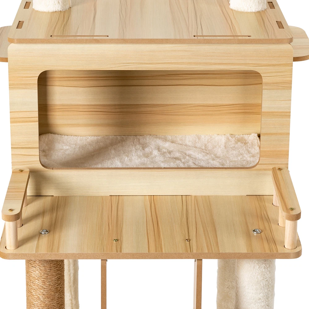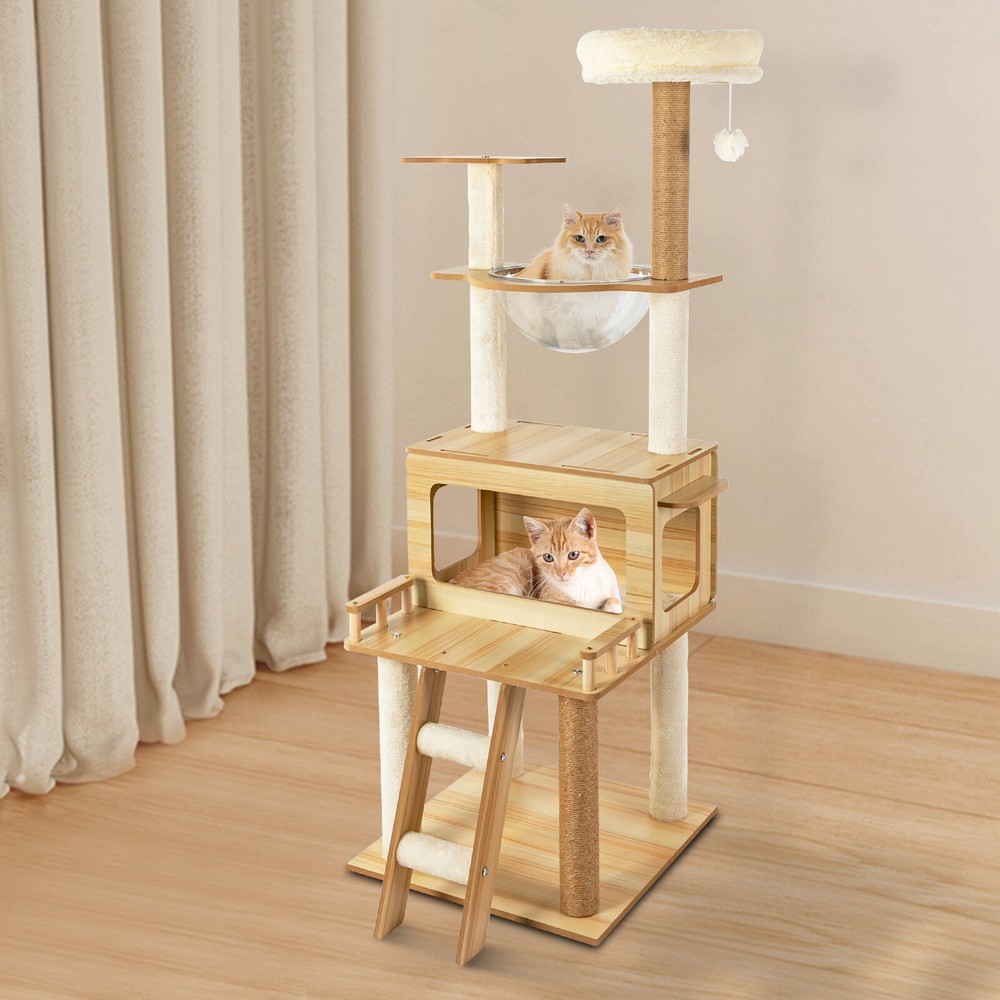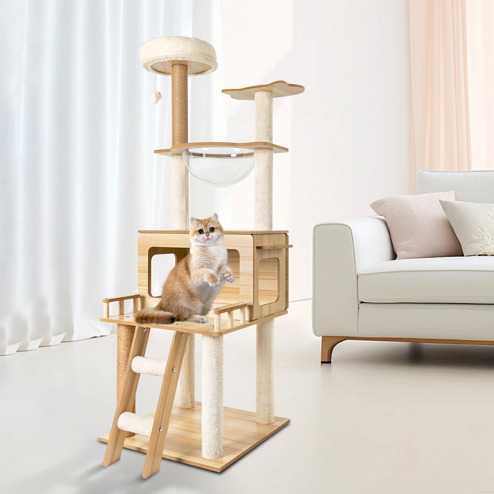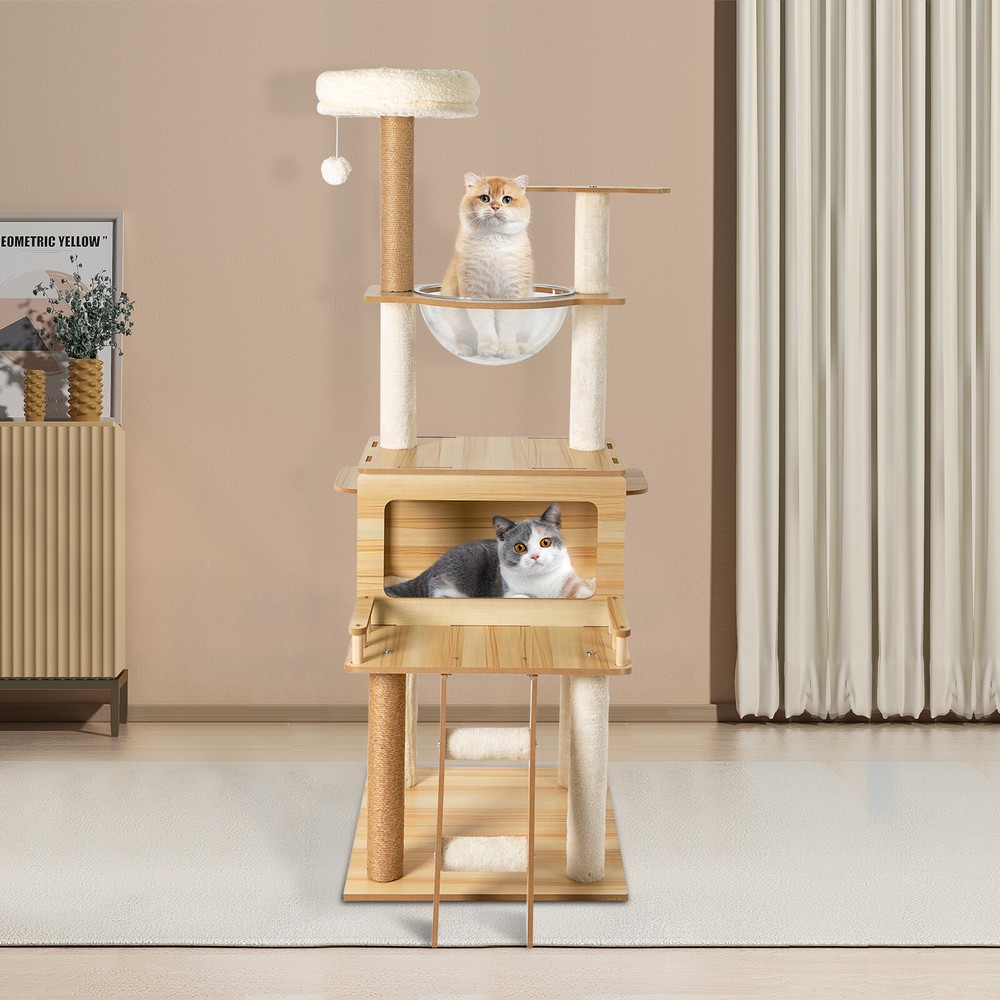 Cat Tree with Climbing Steps and Swing Ball, MDF Cat Tree, Cat Scratching Post Description If your cat is listless all day and scratches the furniture at any time, let's take a look at our cat tree! It can bring your cat a comfortable and pleasant place to play and rest. The sturdy construction and high-quality material ensure the safety of your cat and extend the life of this product. It has a cute appearance that you can send to your friends or family who love cats. Key Features Build to Last: Sturdy MDF and cardboard tube, soft flannelette, wear-resistant and scratch-resistant hemp rope, and the veneering process make it very safe and comfortable for cats and can perform well for a long time. Multiple Functions: The spacious cat tree expands the available area and provides a comfortable space for cats. It comes with scratching posts, wide platforms, a space capsule, cat nests, and a play ball for your cat to scratch, play, and sleep on this cat tree. This will make your cats more lively. With it, your pet can enjoy exploring and sniffing around their new home without scratching your furniture, carpet, clothes, and more. Good Helper: The hemp rope covering multiple pillars helps unleash the nature of cats, cultivate cats' interests, relieve their loneliness and anxiety, help sharpen their claws, improve their physical and mental health, and better promote their growth. Comfortable Experience: The acrylic space capsule with high transmittance and a concave fluid design that allows you to view your cat fully. In addition, it can satisfy the habit of cats curling up to sleep and better protect their spine. It can also let cats see the scenery outside. Soft nest pads make cats more comfortable, even in cold winter without worrying about cats getting cold. Eye-catching Appearance : It combines natural log color with chic white and has a cat-shaped platform, so this item can easily blend in with most home styles and upgrade your space. Strong Load-bearing Capacity: The sturdy material and stable square base (19.7*19.7 inches) with non-slip pads endow the product with a load-bearing capacity of approximately 22 lbs, making it suitable for use by the vast majority of cats. Assembly in a Breeze: Complete accessories, pre-drilled holes, a detailed English installation diagram, and a simple structure allow you to complete the assembly in a very short time to let your beloved pet enjoy the comfort! Space-saving: This product fully utilizes vertical space and covers an area of only 19.7*19.7 inches, so you can freely place it in the living room or other corners. Ideal Gift: With a cute appearance and practical functions, it is an excellent gift for family, friends, and lovers who love or have cats. Guaranteed Customer Service: We aim to provide quality products and services. If you have any problems, please feel free to contact us. We will reply and solve the problem for you as soon as possible. Details Climbing Steps : Multiple steps allow even elderly cats and cats with limited mobility to easily climb up and down. Round Corners: The round edges without any sharpness and burr avoid hurting the cat's claws, thus improving the safety and comfort of use. Application It is suitable for all kinds of cats less than 22 lbs to jump, scratch, sleep, climb, play, etc. You can place this cat tree in your living room, bathroom, balcony, playroom, study room, pet shop, and so on. Specifications Material: MDF, Cardboard Tube, Flannelette, Hemp Rope, Acrylic Surface Treatment: Veneering Color: Log Color, White Style: Modern Uses: Indoor Model: b35 Target Species: Cat Assembly Required: Yes Mount Type: Floor Mount Load-bearing Capacity: About 10kg/22 lbs Product Size: 50*50*147cm/19.7*19.7*57.9in Package Included 1* Cat Tree 1* English Installation Diagram All Accessories for Assembly Notes If the product is scratched or damaged by the cat's paws, please repair or replace it before continuing to use it to avoid further harm to your cat. Cats have a high level of vigilance toward new things. You can use their favorite toys to lure them a little, and they will quickly become familiar with and like this product. Because cats like to jump and play, for safety, we recommend that you connect this product to a wall to enhance stability. Please allow the slight color difference caused by the shooting light and 1-3cm error due to manual measurement, and make sure you do not mind before you order. Payment Delivery details Terms of sales About us Contact us Payment We accept ebay payment 。 Fees such as import duties, taxes are not included in the item price or shipping costs. These charges are the buyer's responsibility. Delivery details Shipping: 2-9 working days to: USA Terms of sales We maintain high standards of excellence and strive for hundred percent customer satisfaction. Feedback is very important to us. We hope that you contact us immediately before you give neutral or negative feedback, so that we can address your concerns. It is impossible to address issues if we do not know about them! About us Your satis faction is our ultimate goal. We work hard to earn your trust and future business. Our certified technicians have tested each item before shipping. The unit comes with 1 year limited warranty on all manufacturing defects. a) If you receive a defective item, you may return it or ask for a discount. Please contact us within 14 days after you receive the package. b) What you returned must be intact and in its original packaging as re? u. Customer is responsible for shipping costs of the returned item. c) We will cover the cost of shipping back t with the shipping rate indicated in the registration page. We will send you a new unit or refund the full payment you paid. Thank you. Contact us Business Hour Business Hour: Monday To Friday: 8:30 AM to 5:00 PM (Beijing China time) Due to time zones, our reply to your questions may not be immediately. But within above working time, we will reply your email within 24 h