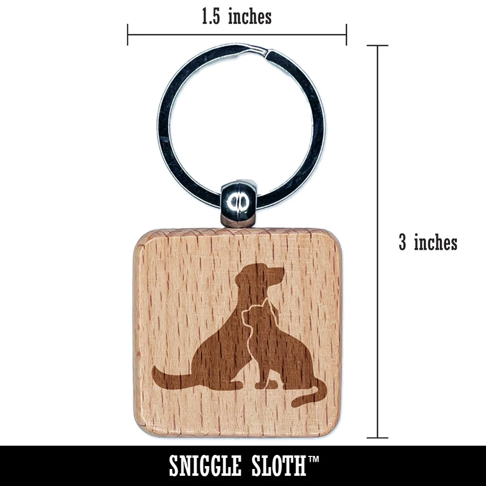 Cat and Dog Sitting Together Pet Engraved Wood Square Keychain Tag Charm