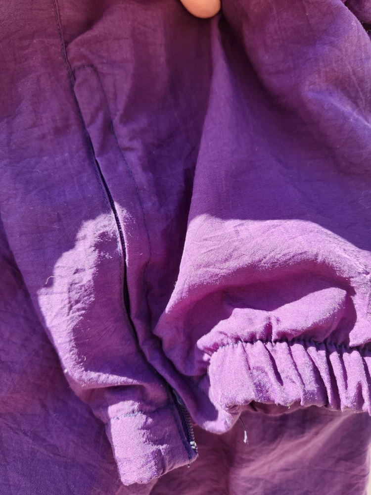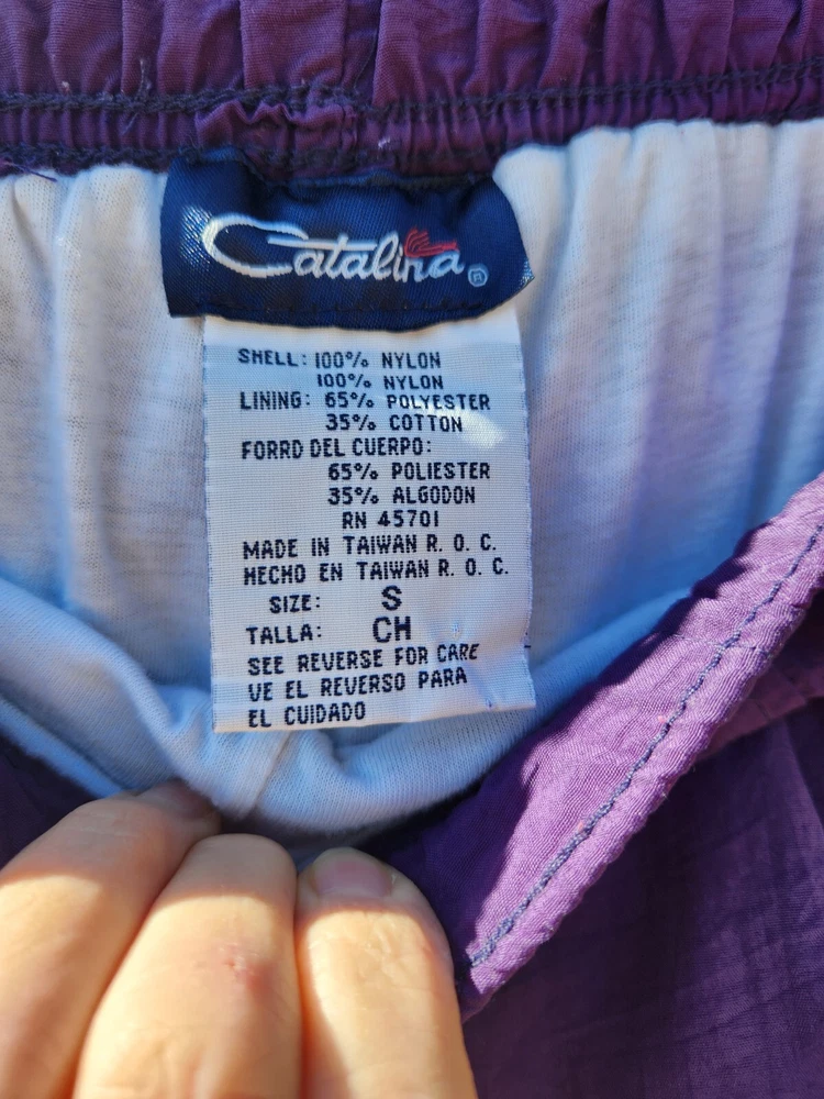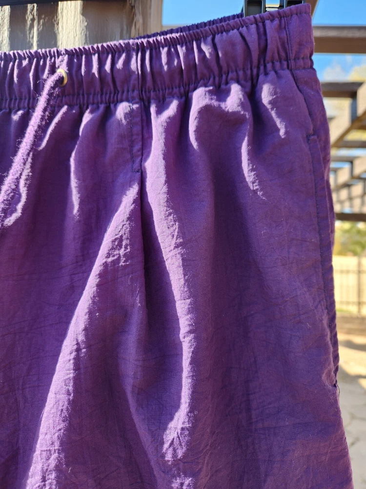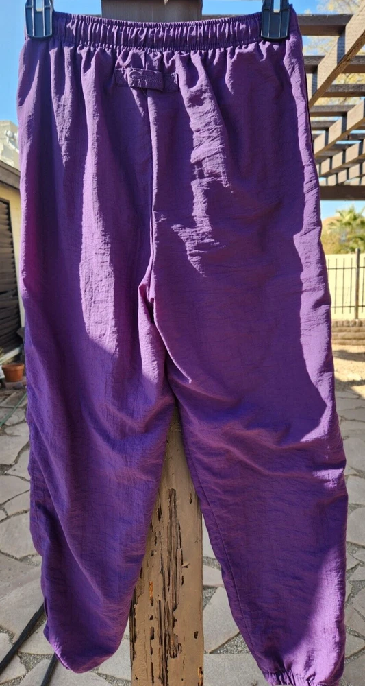 Catalina Nylon Fully Lined Sweat Pants with Zippered Elastic Cuffs and Drawstring & Elastic Waist in Purple, size Small. This pant features 2 front pockets. Lying flat and unstretched, this pant measures 14" through the waist, 20" across the hips and is 39.5" in length from the waistband and have a 28.5" inseam. The rise measures 13". These pants have been worn but are clean and in good condition. They have been stored in my smoke-free home. Feel free to email me with any questions you might have.