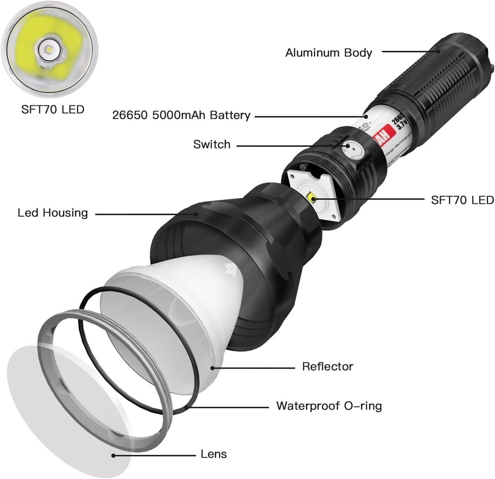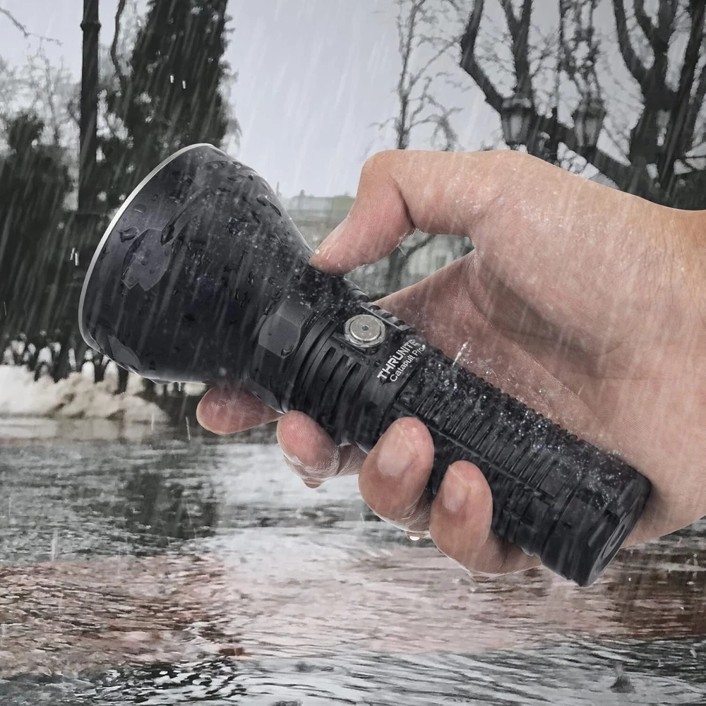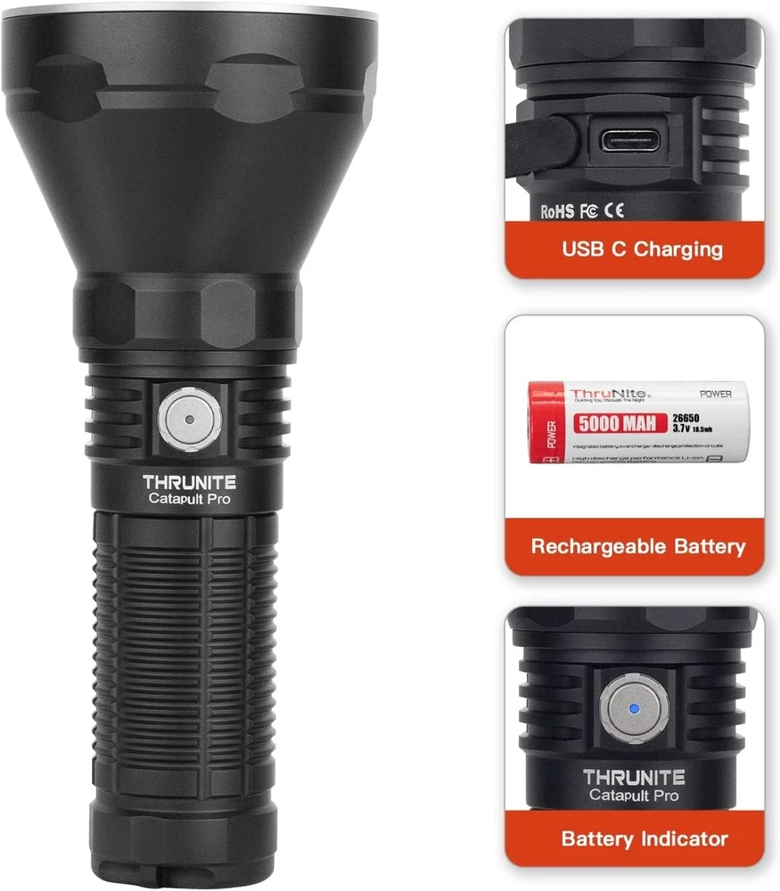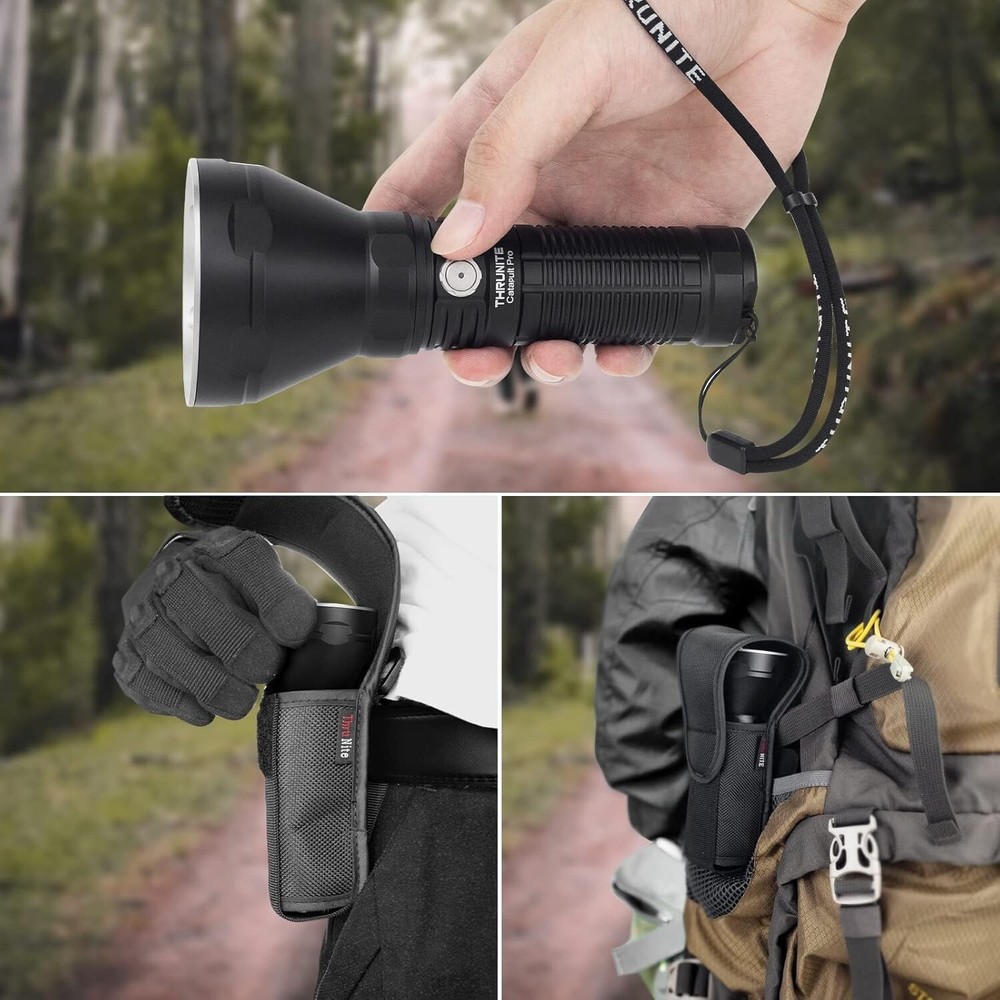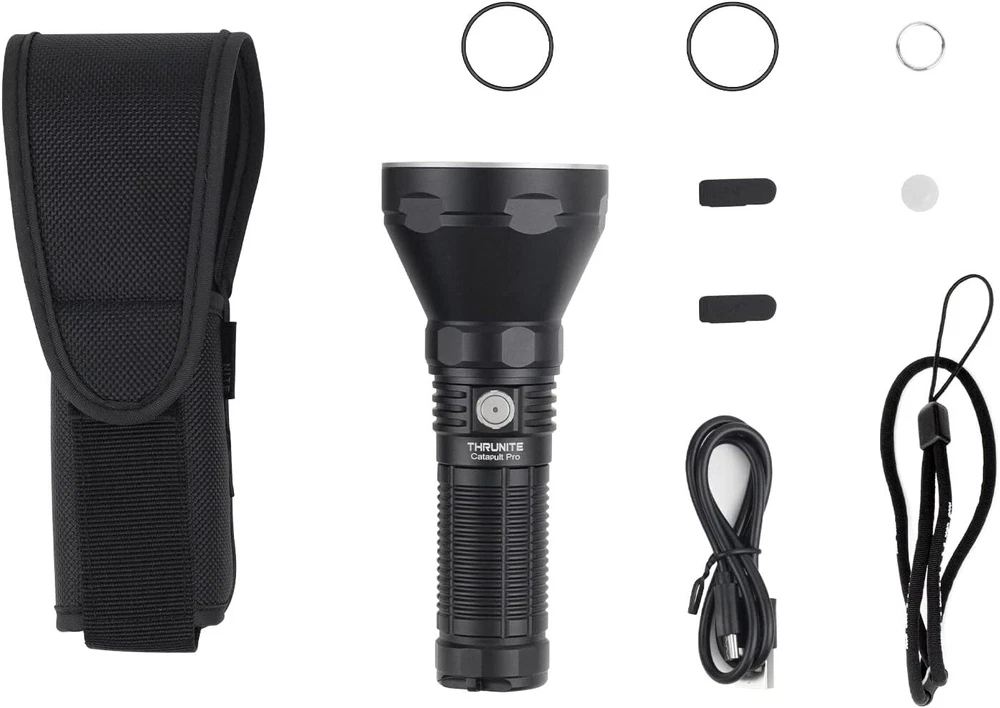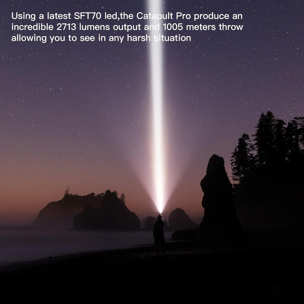 Please note that the new Catapult Pro SFT70 has a slight difference in max output & beam distance than the old one because of the new update of the latest LED. POWERFUL LONG THROW -- The Catapult Pro can produce a maximum output of 2,713 lumens with an upgraded SFT70 LED that produces a perfectly balanced beam with a distance up to 1005 meters. USB C RECHARGEABLE -- The Catapult Pro is powered by the included high capacity battery, which is easily recharged with the fast charging port and provided charging cable. RELIABLE AND DURABLE -- Constructed from aerospace grade aluminum body, the rugged construction allows the Catapult Pro to withstand drops up to 1.5 meters with ease. The tactical knurling on the body is specially designed for a firm grip and the hidden lanyard hole and holster allow portability. VERSATILE MULTI-USAGE -- With five brightness levels (Firefly, Infinity Low, Infinity High, Turbo, and Strobe) the Catapult Pro is great in many scenarios such as hunting and rescue operations.
