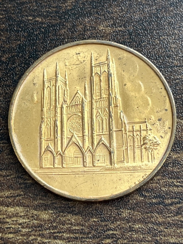 The product is a rare vintage medal token from the Cathedral Church of St. John The Divine in New York. This unique piece of exonumia originates from the United States and serves as a collectible item for those interested in religious artifacts or historical tokens. The depiction on the medal likely holds significance for members of the congregation or collectors of religious memorabilia, making it a unique and valuable piece of history.