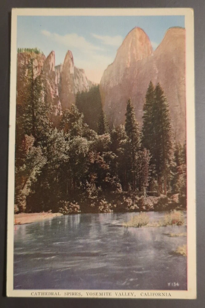 Antique Souvenir Postcard Cathedral Spires Yosemite Valley California 1924. There may be wear on the edges or a bent or torn corner, staining or writing on the card, creasing, or the card may have a cancellation mark. Most of the postcards I sell are 50 to 100+ years old and will never be perfect. Please examine the photos carefully for condition information. All postcards with a value of less than $20 are shipped via eBay Standard Envelope with a 2 mm postcard sleeve and a piece of cardstock on either side, taped closed with masking tape and placed in a heavy cardboard mailer. Postcards with a value of more than $20 are sent Ground Advantage in a 2 mm postcard sleeve, sandwiched between cardboard and shipped in a padded polybag. Both methods are provided with tracking.