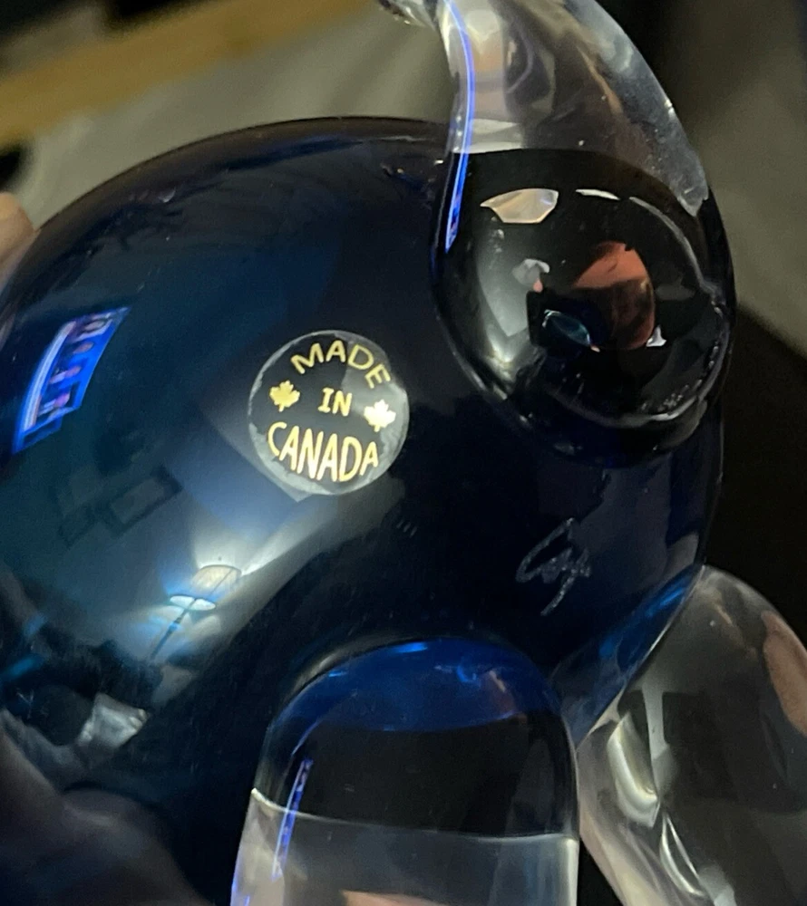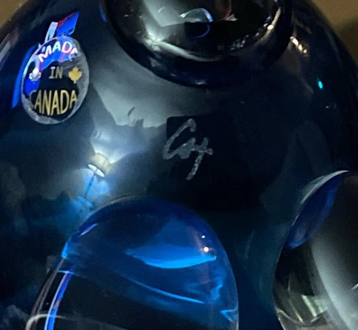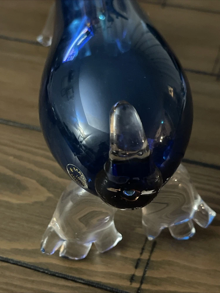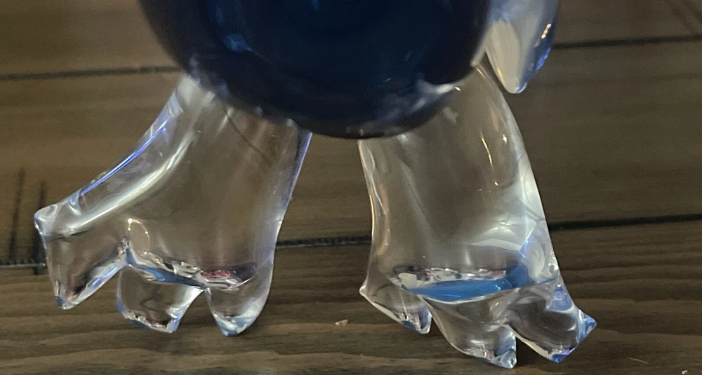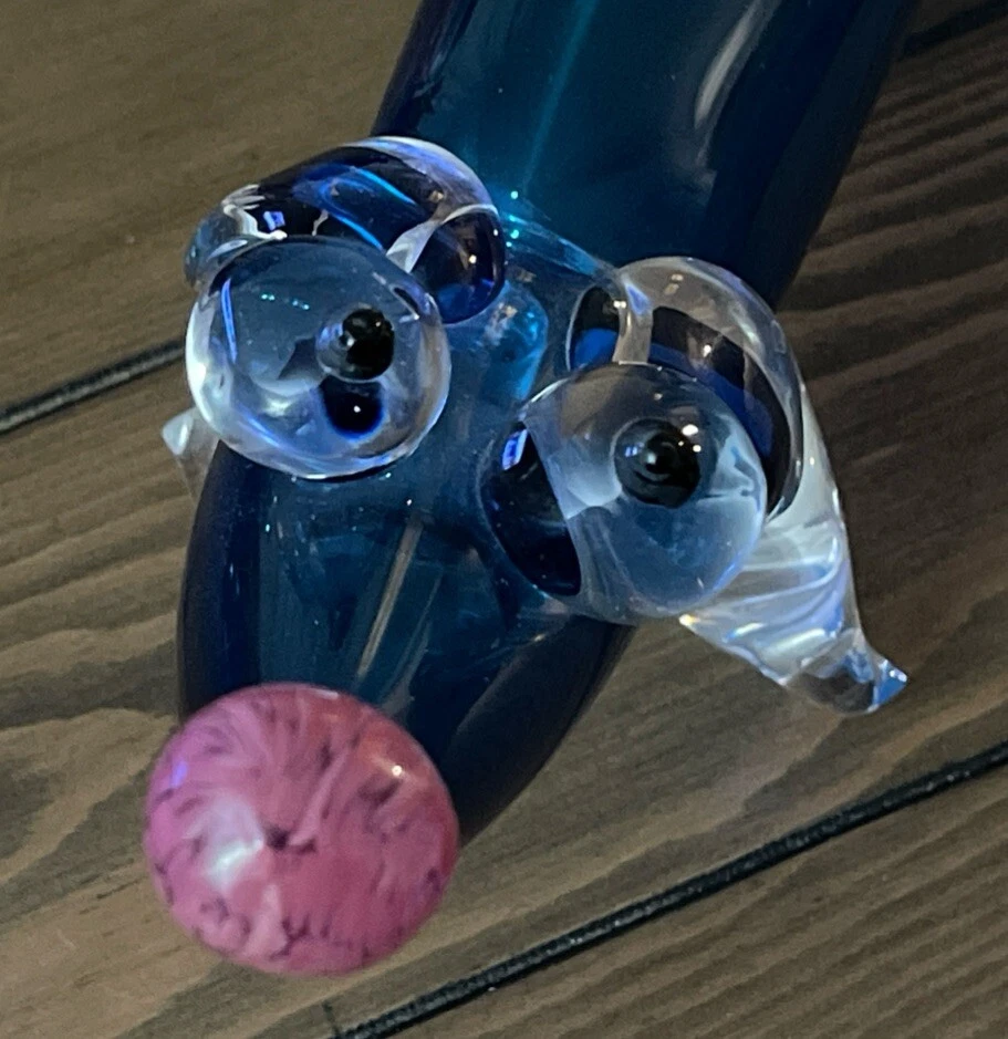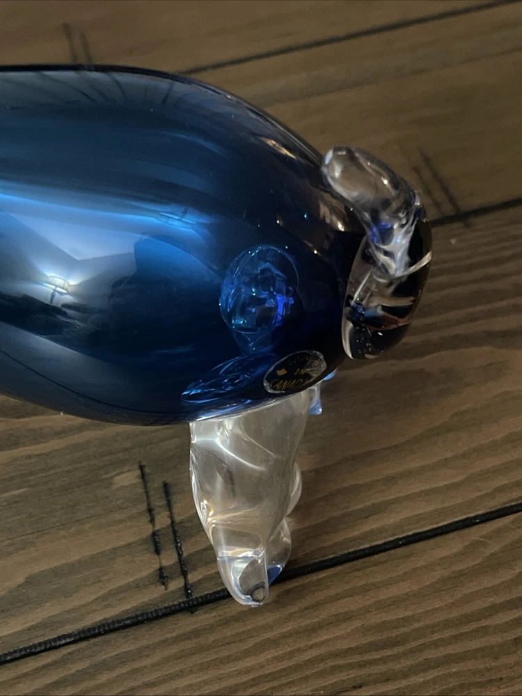 This Catherine Labonte glass sculpture features a contemporary design of a Weiner Dog in transparent blue glass. Measuring 13 inches in length, 6 inches in height, and 3 inches in width, this hand-blown piece showcases a pink swirled nose, adding a whimsical and colorful touch to the figurine. Signed by Catherine Labonte, this original art glass sculpture is a unique and playful addition to any collection, highlighting the artist's expertise in creating novelty pieces with a studio aesthetic. Gorgeous and fun - no chips or cracks - no scratches that I can see or feel - sooo cute for dog or Weiner dog lovers!