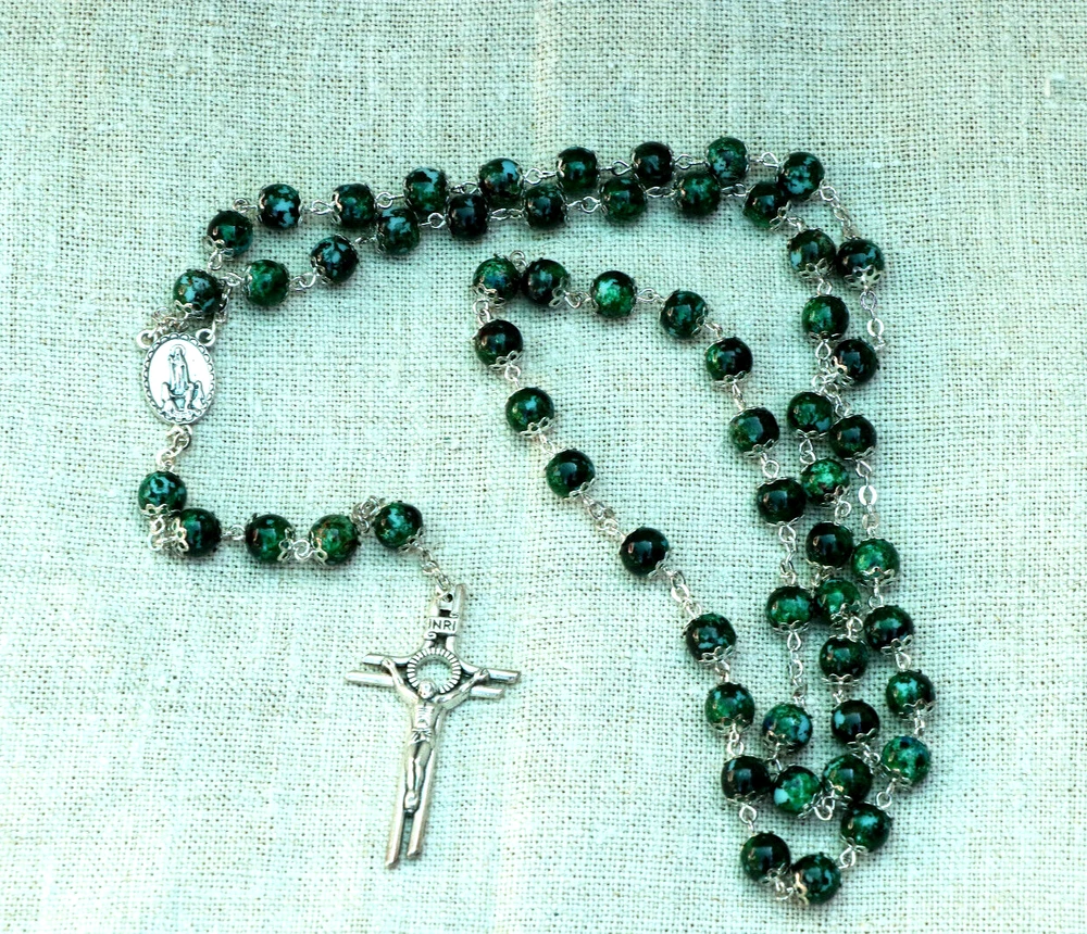 Catholic Dark Green stained Glass Beads Rosary 8mm Medal Cross This rosary is hand made to create a beautiful and a classic piece for Christians as a prayer aid. Ideal for Daily use or Wall Decor in Home. Great for first a communion gift, or First Communion . The centrepiece for this gorgeous Rosary is Virgin Mary with Jesus Material: Glass Colour: Dark Green Appears to be exceptionally well made with wrapped wire construction.