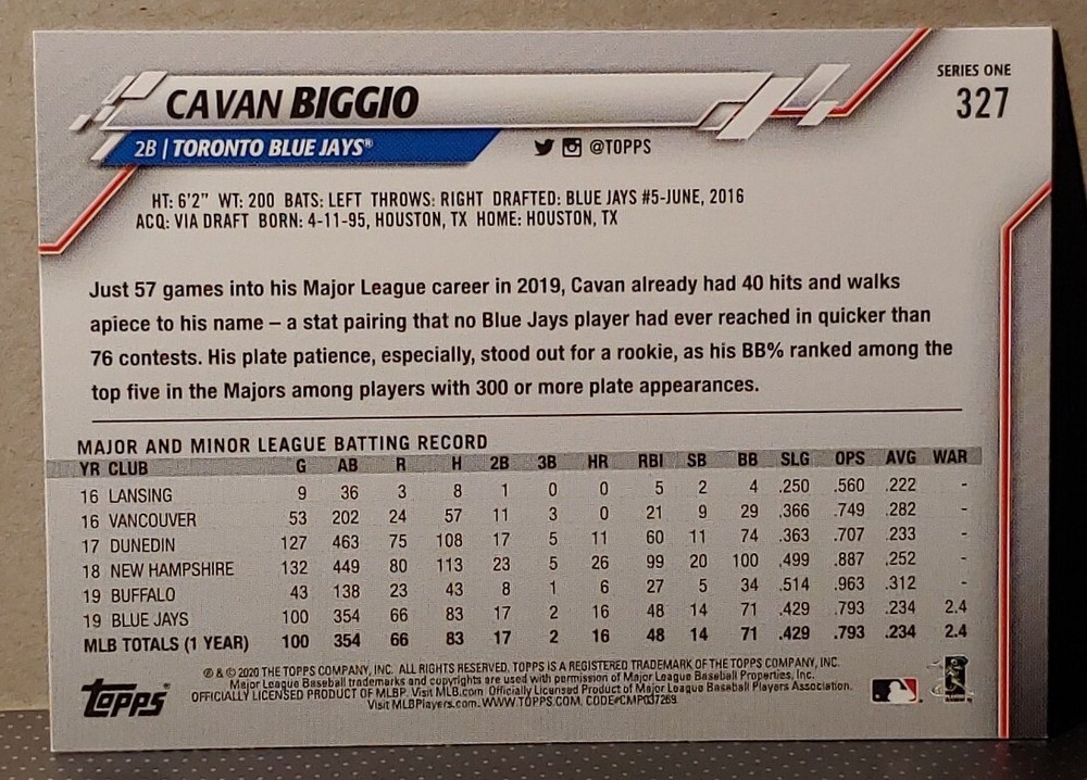 2020 Topps Series 1 Baseball #327 Cavan Biggio Toronto Blue Jays - Future Stars Ungraded Card / See Photos See scans in listing for images of the card you are buying. As per new eBay listing standards, card is approximated to be Near Mint or better. See below for PSA standards for Near Mint. Combined shipping available! To Canada - First single card $1.29, no charge for additional single cards! To USA - First single card $1.75 CDN, $0.50 CDN extra per additional single card. International - First single card $3.50 CDN, $0.50 CDN extra per additional single card. ** Discount should apply automatically in your cart. Please let me know if it doesn't. ** eBay may calculate and collect applicable taxes to your area upon checkout. NM 7 (Near Mint): A PSA NM 7 is a card showing slight surface wear visible only upon close inspection. There may be slight fraying on some corners. Picture focus may be slightly out-of-register although a minor printing blemish is acceptable. Slight wax staining is acceptable on the back of the card only. Most of the original gloss is retained. Centering must be approximately 70/30 to 75/25 or better on the front and 90/10 or better on the reverse. Shipped with Canada Post Lettermail.