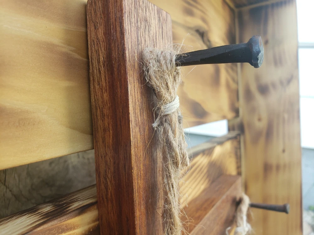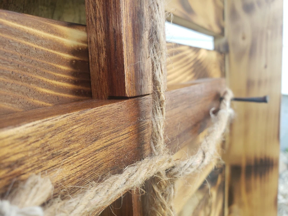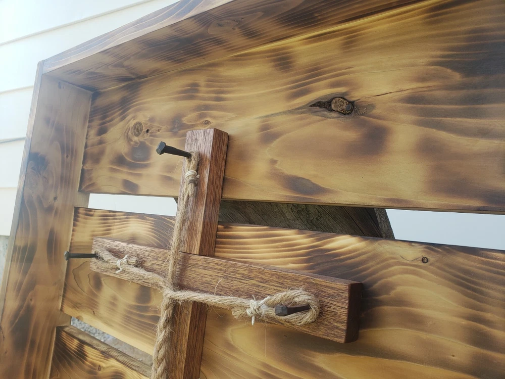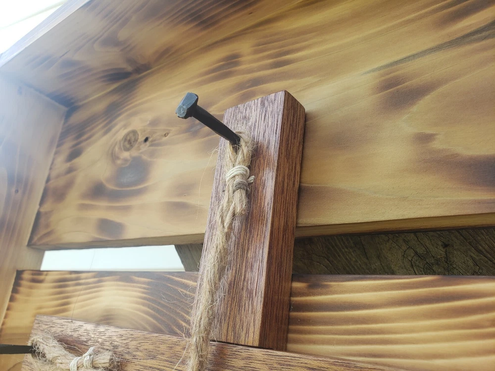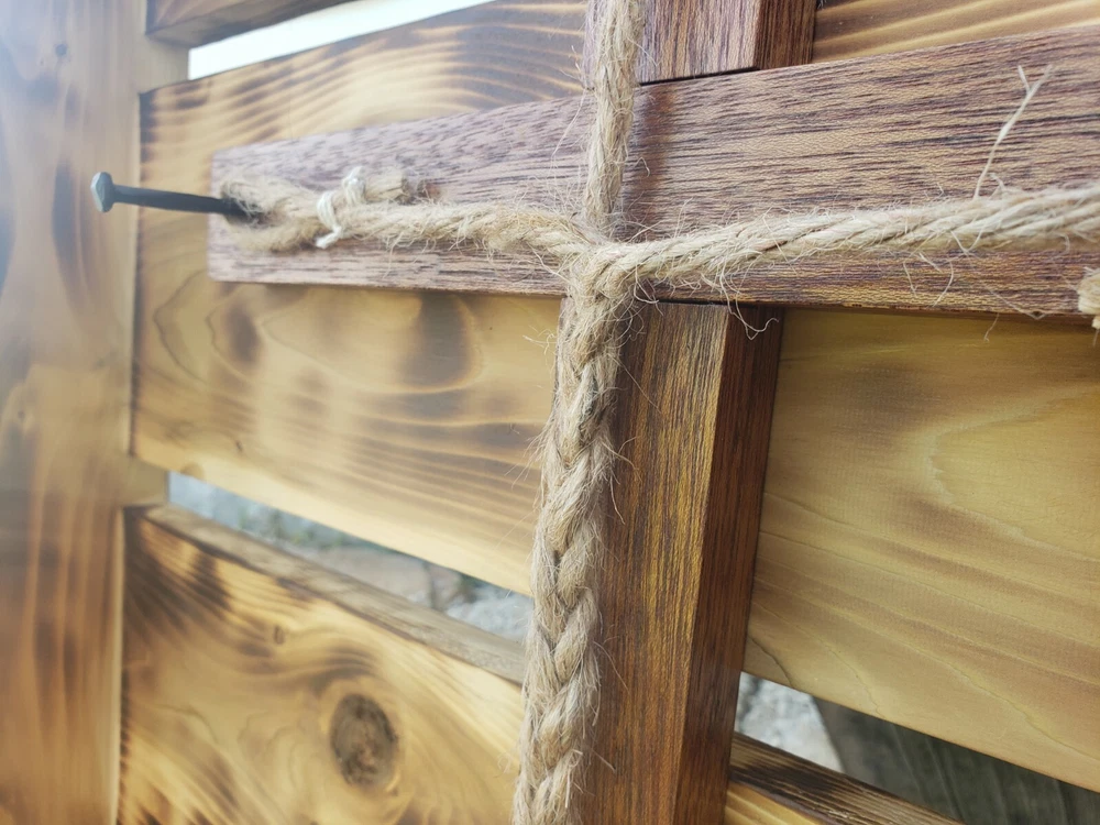 We made this ourselves from local cedar! The cedar logs were even planked out with a relative's saw rig, and we planed the cedar from there. The cedar was finished with burning and oiling, and the hickory (I'm not 100% positive it's hickory, but I'll go with 95% positive.... the grain sure looks like it, so I think it's hickory...) was finished with staining. The ropes are natural sisal and craft hemp. It's great for a wedding or even to just hang on the wall as a decorative piece. The outside dimensions are 26"x21.5".