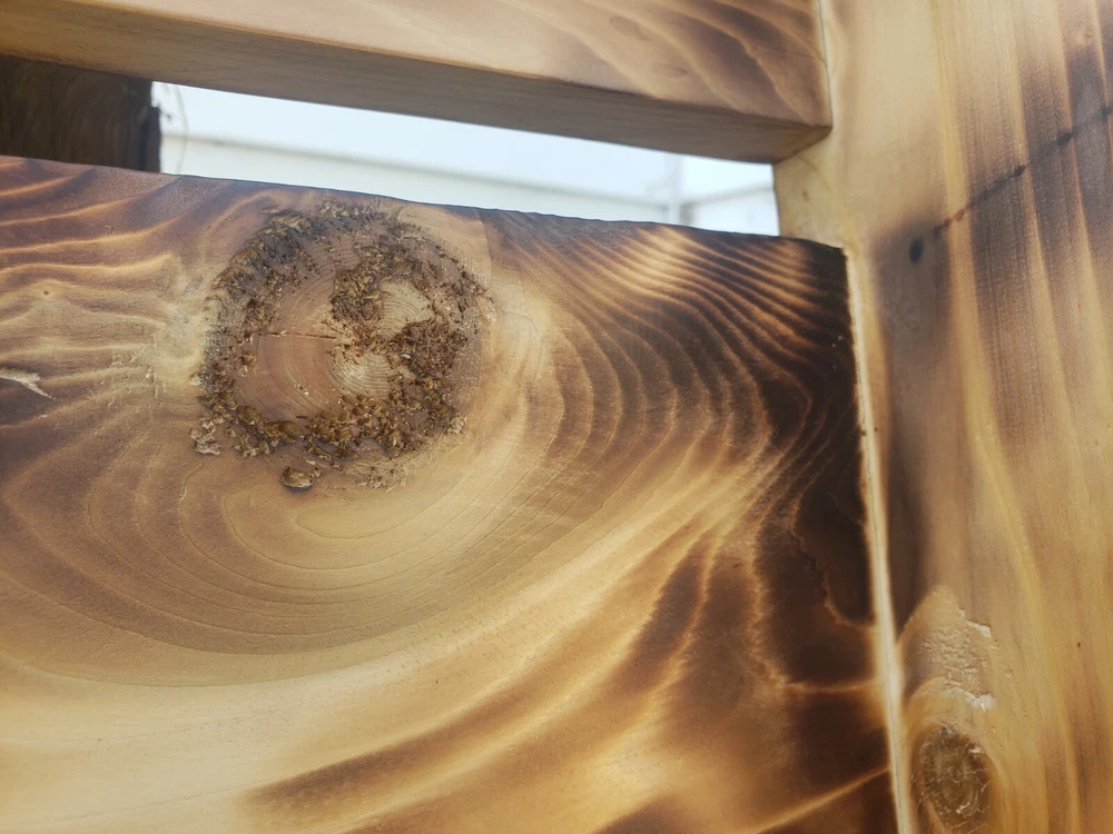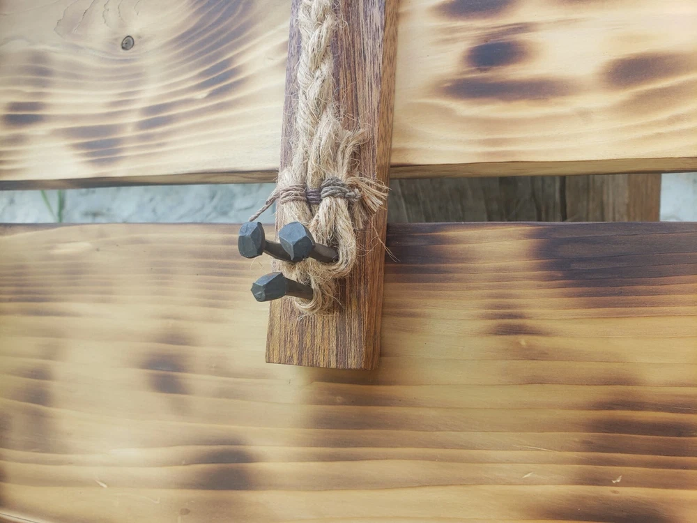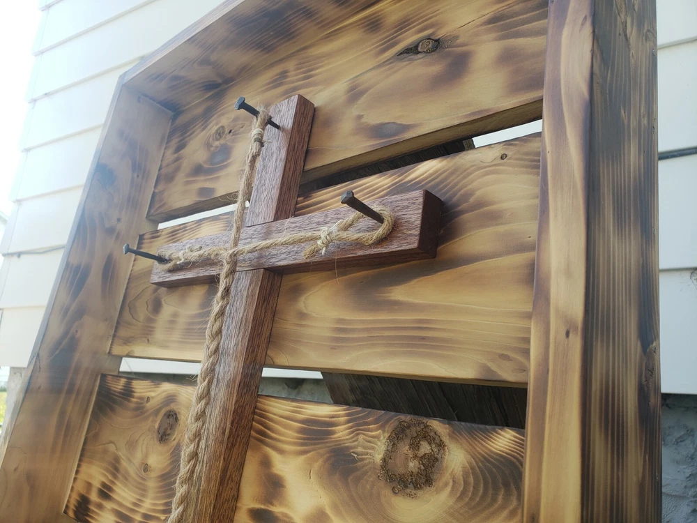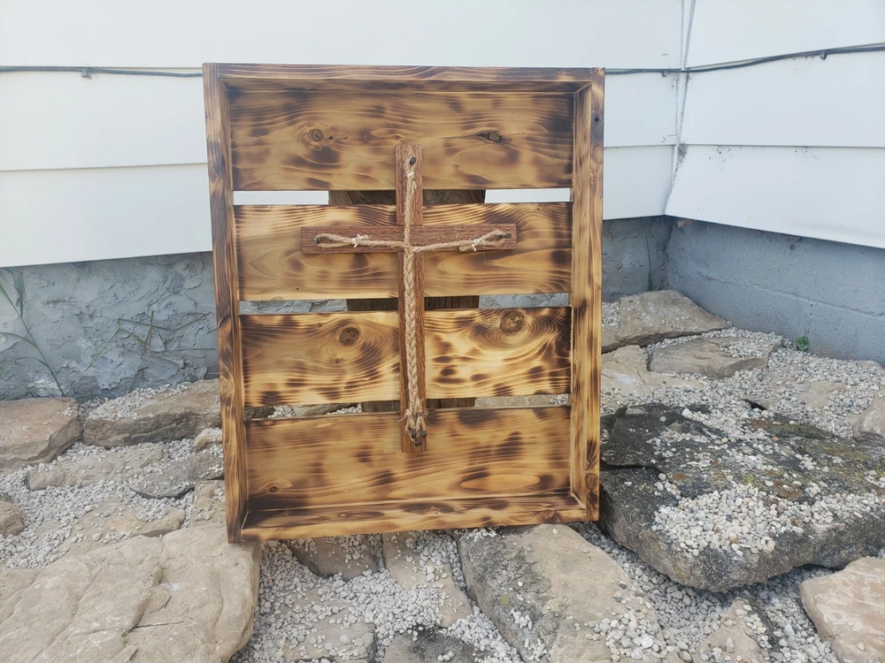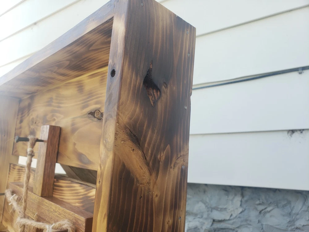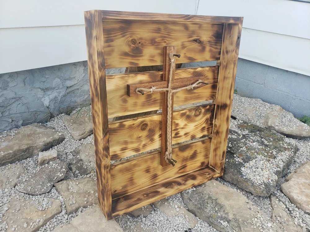 We made this ourselves from local cedar! The cedar logs were even planked out with a relative's saw rig, and we planed the cedar from there. The cedar was finished with burning and oiling, and the hickory (I'm not 100% positive it's hickory, but I'll go with 95% positive.... the grain sure looks like it, so I think it's hickory...) was finished with staining. The ropes are natural sisal and craft hemp. It's great for a wedding or even to just hang on the wall as a decorative piece. The outside dimensions are 26"x21.5".