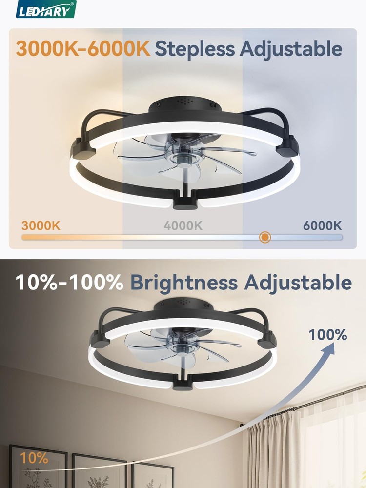 Ceiling Fans with Lights and Remote Stepless Dimming: Our ceiling fans with lights has 3 color temperature from warm (3000K) to white light (6000K), brightness from 10%-100% with 2800LM and light memory function Remote and App Control: Our ceiling fan can be controlled by a remote / APP, the fan and lights receives data 360° in all directions and can be controlled separately. 6 speeds, Dimmable, timer setting, customize the mode you need as you like 6 Speeds and Low Noise: Our ceiling fans feature a 7-blade design with 6 wind speeds. The pure copper motor runs smoothly, with strong wind and low noise. And canceled the beeping sound when the remote control transmission signal Reversible DC Motor: Our flush mount ceiling fan offers 2 airflow modes. It runs downdraft cool airflow during summer, updraft airflow in winter.The pure copper motor runs smoothly, provides strong wind power Easy to Install: The instructions we provide contain detailed installation guide video that are easy to and can be completed in a short time. We provide 2-year . If you have any issues please tell , we'll reply within 24 hours