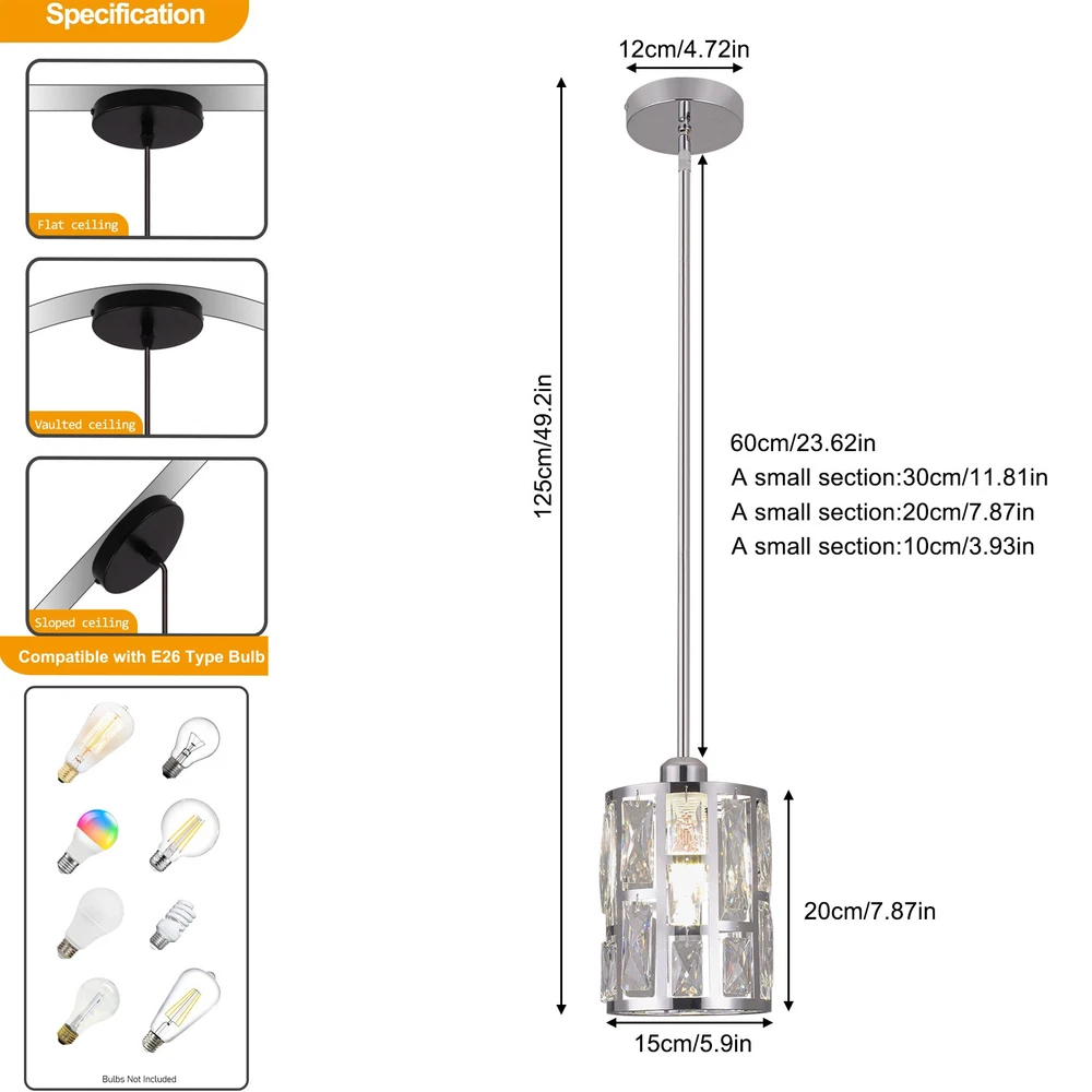 Description This ceiling light is both fashionable and practical. The combination of metal frame and crystals gives it a luxurious and exquisite look, adding a cozy and exquisite visual effect to the room. The standard E26 lamp holder makes it compatible with a variety of bulbs, and you can also adjust the height of the light according to your needs. This product is not only a lamp, but also a beautiful decoration. Come and buy it. Key Features Eye-catching Appearance: The noble and elegant silver frame is combined with highly clear crystals, adding a touch of sophistication to the fixture. When the light is on, the light reflected from the exquisite crystal casts a fascinating glow, bringing you an extremely beautiful visual enjoyment and romantic atmosphere. Sturdy and Durable: This pr Ceiling-mounted Light, Adjustable Height, Modern Crystal Pendant Light Fixture? Description This ceiling light is both fashionable and practical. The combination of metal frame and crystals gives it a luxurious and exquisite look, adding a cozy and exquisite visual effect to the room. The standard E26 lamp holder makes it compatible with a variety of bulbs, and you can also adjust the height of the light according to your needs. This product is not only a lamp, but also a beautiful decoration. Come and buy it. Key Features Eye-catching Appearance: The noble and elegant silver frame is combined with highly clear crystals, adding a touch of sophistication to the fixture. When the light is on, the light reflected from the exquisite crystal casts a fascinating glow, bringing you an extremely beautiful visual enjoyment and romantic atmosphere. Sturdy and Durable: This product is made of premium iron and crystal and adopts an electroplating process, which is rust-proof, and corrosion-resistant, and can be used for a longer time. Convenient to Use: The standard E26 lamp holder can support the use of LEDs, Halogens, etc., making it very convenient for you to buy and replace bulbs. Wide Adaptability: You can adjust the height of the lamp to suit rooms of different heights by changing the number of suspension rods. In addition, this product can be mounted on sloped ceilings, making it highly adaptable. Dimmable Design: By purchasing dimmers and dimming bulbs (both not included), you can also adjust the light to create different lighting effects. Simple Installation: The simple structure, complete accessories, and English manual allow you to quickly and easily complete the installation and start to use it. Easy to Clean: Thanks to the simple construction, the light is easy to clean, and you just need to gently wipe it to remove the dust on the surface. Protective Package: Foam can effectively reduce the normal impact and ensure that it is fully delivered to you to the greatest extent. Ideal Gift: With its elegant appearance and practical function, it is a good gift for friends, loved ones, coworkers, and other people on holidays, birthdays, or housewarming days. Good Service: We aim to provide quality products and services. If you have any problems, please feel free to contact us. We will reply and solve the problem for you as soon as possible. Details Smooth Edges: They not only ensure safer use but also improve the beauty of the product. Stable Base: The thickened base of 4.72" in diameter increases stress area and can make the item fixed firmly without falling easily. Application It can be used in living rooms, bedrooms, kitchens, dining rooms, reading rooms, apartments, villas, malls, hotels, restaurants, coffee shops, dessert stores, and other places. Specification Material: Iron, Crystal Process: Electroplating Color: Silver Shape: Cylinder Style: Modern Indoor/Outdoor Usage: Indoor Assembly Required: Yes Control Method: Wall Switch (Not Included) Mount Type: Ceiling Mount Voltage: 110V Light Source: 1* E26 Bulb (Not Included) Efficiency: E Max. Bulb Power: 60W Adjustable Height: Total 60cm/23.62in (30cm/11.81in, 20cm/7.87in, 10cm/3.93in) Suitable for Room Height: 2.6-3m/8.53-9.84ft Overall Height: 125cm/49.2in Base Diameter: 12cm/4.72in Lampshade Size(D*H): 15*20cm/5.9*7.87in Package Size: 25*15*15cm/9.84*5.91*5.91in Gross Weight: 1.5kg/3.31 lbs Net Weight: 1.2kg/2.64 lbs Package Included 1* Ceiling Light 1* Base 1* English Manual All Accessories for Installation Notes Please check the dimensions of the product before ordering to ensure it fits your home. Please note that the bulb is not included and you will need to purchase an E26 bulb yourself. Please disconnect the power supply before installation, and wear insulated gloves (not included), or you can seek professional installation. Please use the lamp within the applicable voltage range and clean it regularly. Please cut off the power supply when you clean the light or replace the light bulb. Please wipe with a soft cotton cloth and do not use household cleaning agents. Please read the instructions carefully before installation and use. Please note that this product is not waterproof, so please do not use it outdoors. Please note that the brightness depends on the power of the bulb. Please allow the slight color difference caused by the shooting light and 1-3cm error due to manual measurement, and make sure you do not mind before ordering. Payment Delivery details Terms of sales About us Contact us Payment We accept ebay payment 。 Fees such as import duties, taxes are not included in the item price or shipping costs. These charges are the buyer's responsibility. Delivery details Shipping: 2-9 working days to: USA Terms of sales We maintain high standards of excellence and strive for hundred percent customer satisfaction. Feedback is very important to us. We hope that you contact us immediately before you give neutral or negative feedback, so that we can address your concerns. It is impossible to address issues if we do not know about them! About us Your satis faction is our ultimate goal. We work hard to earn your trust and future business. Our certifi